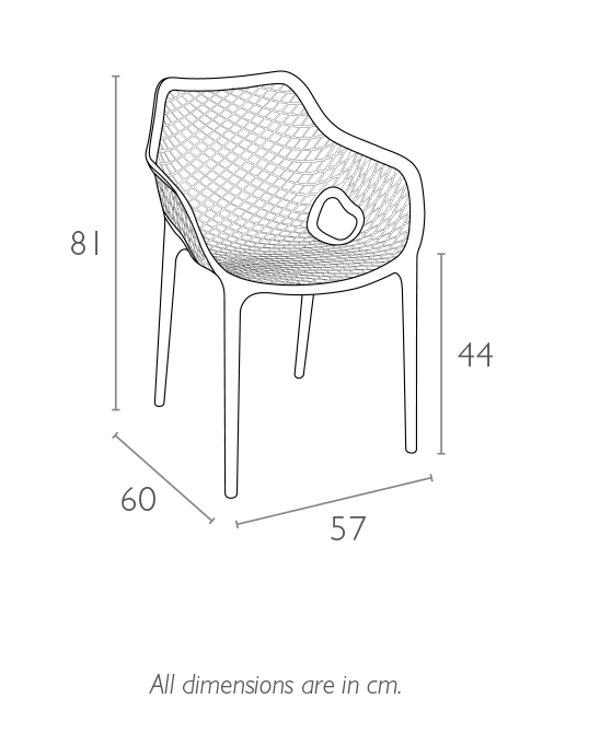 Легкое, как сам воздух, но при этом прочное кресло Air XL изготавливается из полипропилена, упрочненного стекловолокном, полученным с использованием новейшего поколения технологий формования пластмасс под давлением. Пластиковые кресла серии Air с перфорированными сиденьем и спинкой станут отличным выбором для обстановки фуд-кортов, кафе, ресторанов и баров. Благодаря использованию высококачественных материалов они долгое время не теряют своего привлекательного внешнего вида, даже несмотря на активную эксплуатацию. Благодаря устойчивости к ультрафиолетовому воздействию и отсутствию металлического каркаса пластиковые кресла Air можно использовать в том числе и на открытых площадках. Особенности: изготовлено из высококачественного полипропилена, упрочненного стекловолокном; не имеет металлического каркаса - не ржавеет, не поддается коррозии; устойчиво к ультрафиолету и атмосферным осадкам; штабелируемое - занимает минимум места при хранении; подходит для использования на открытом воздухе и в помещении; сертификат CATAS. Открыть технические характеристики.Характеристики