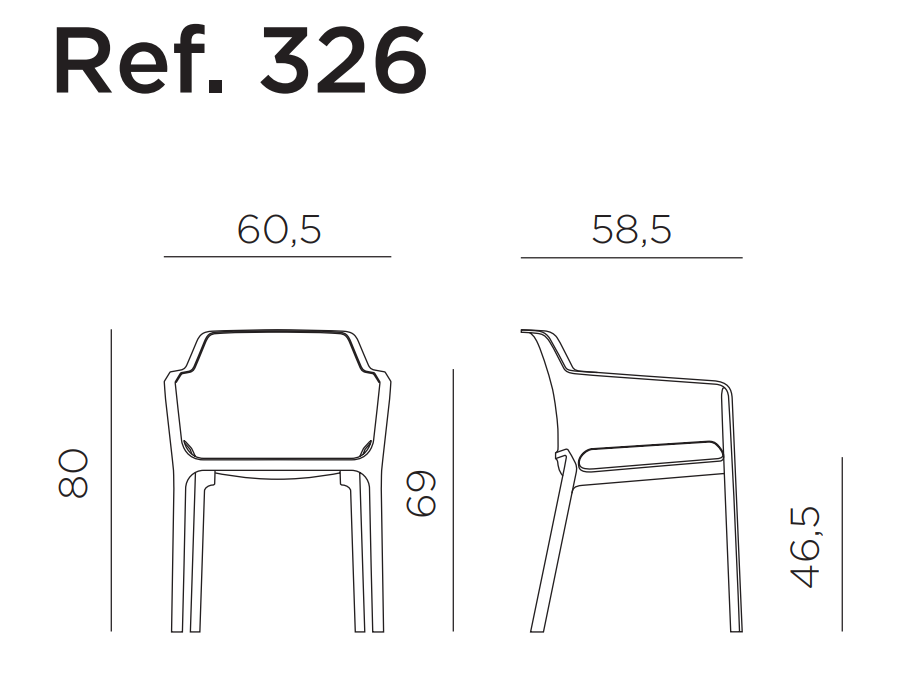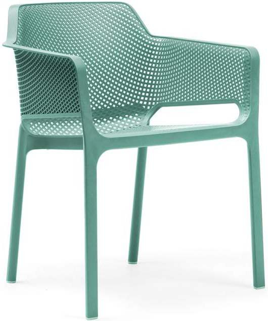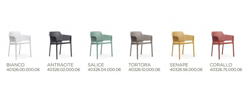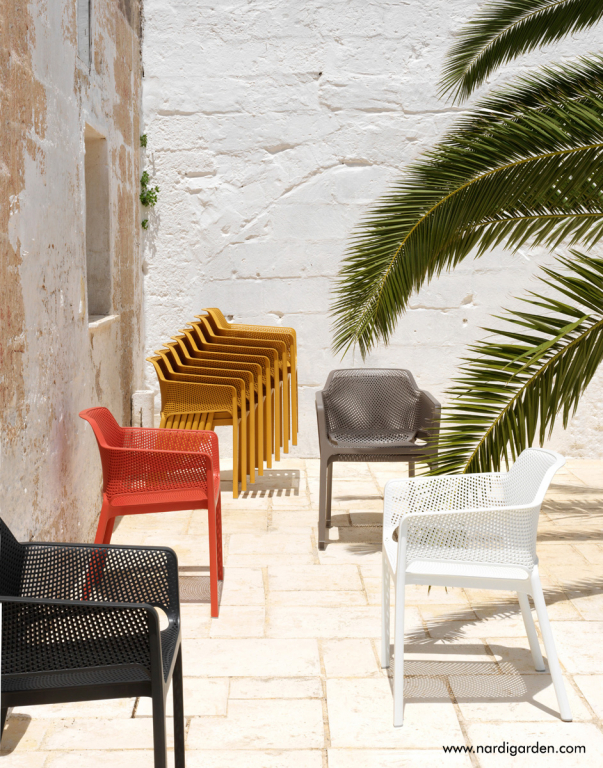 Net – это моноблочная модель из стеклопластика с перфорированным рисунком, который равномерно распределен по трехмерной поверхности сиденья. Материалы не подвержены воздействию УФ-излучения, благодаря этому кресло долго сохраняет свой первоначальный вид и не выцветает на солнце. Кресло оснащено нескользящими накладками на ножках, поэтому его можно разместить возле бассейна, а также оно может штабелироваться, что облегчает его хранение.