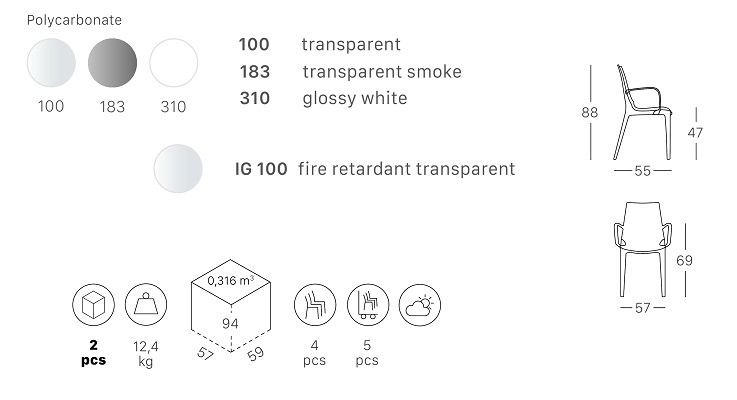 Пластиковое креслоVanityиз поликарбоната от дизайнеровArter & Citton.Идеальное креслодля любого типа обстановки, отличающийся свежим и современным дизайном. Модель характеризуется слегка вогнутой спинкой и сочетает в себе cовременную гармонию линий с оригинальной конструкционной способностью, которая позволяет штабелирование. Особенности: Кресло полностью выполненоизпрочного поликарбоната,пригодного для повторного использования. Возможность штабелирования до 4 шт. для максимального удобства хранения. Данная модель предназначена для использования на летних верандах, террасах, фудкортах, а такжево внутреннем интерьере кафе, ресторанов. Открыть технические характеристики. Информация по уходу:прозрачные стулья можно протирать тряпкой из микрофибры, допускается применение нейтрального мыльного раствора. Запрещается использовать спиртосодержащие или ацетоносодержащие (а также им подобные) средства.Характеристики