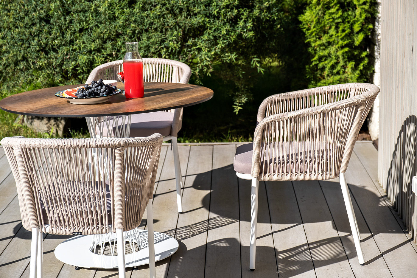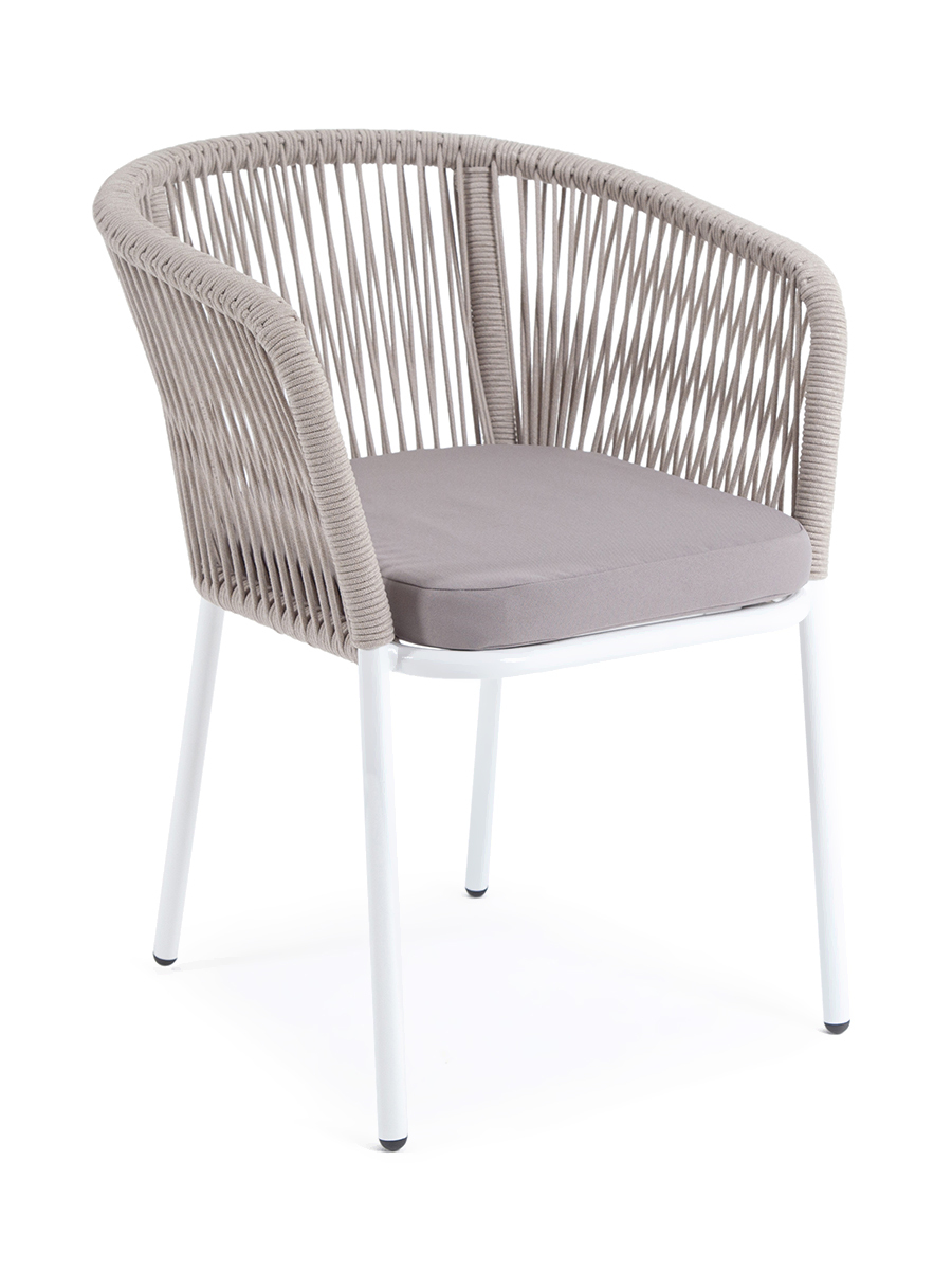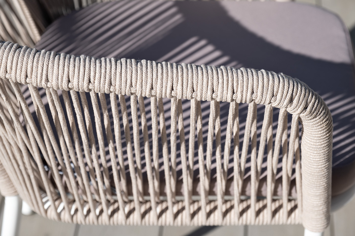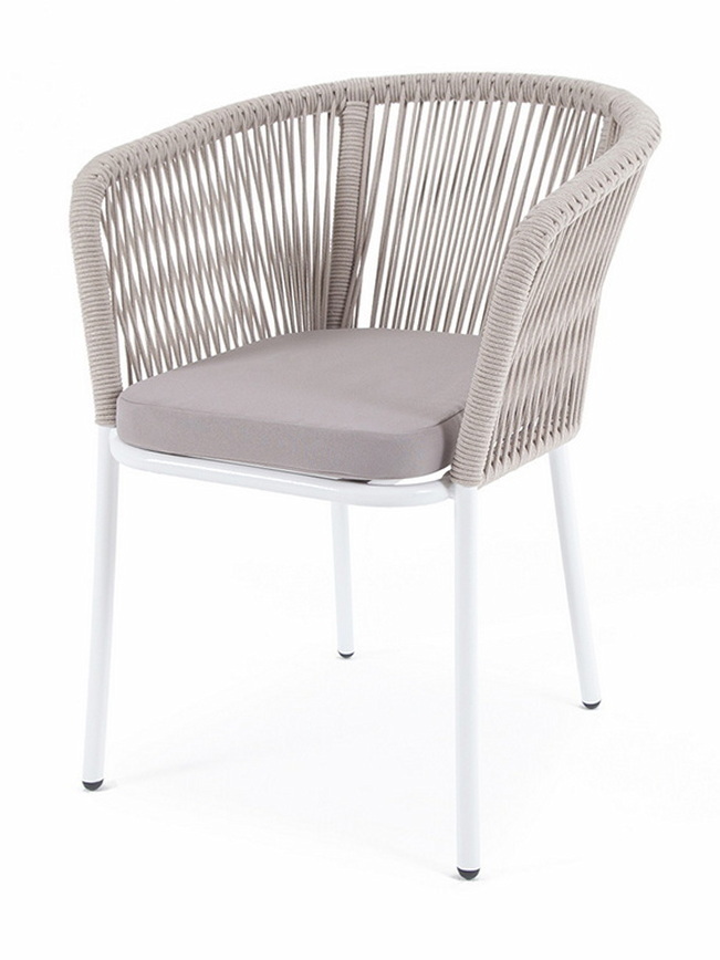 "Марсель" стул плетеный из роупа, каркас алюминий белый муар, роуп бежевый круглый, ткань бежевая 15052