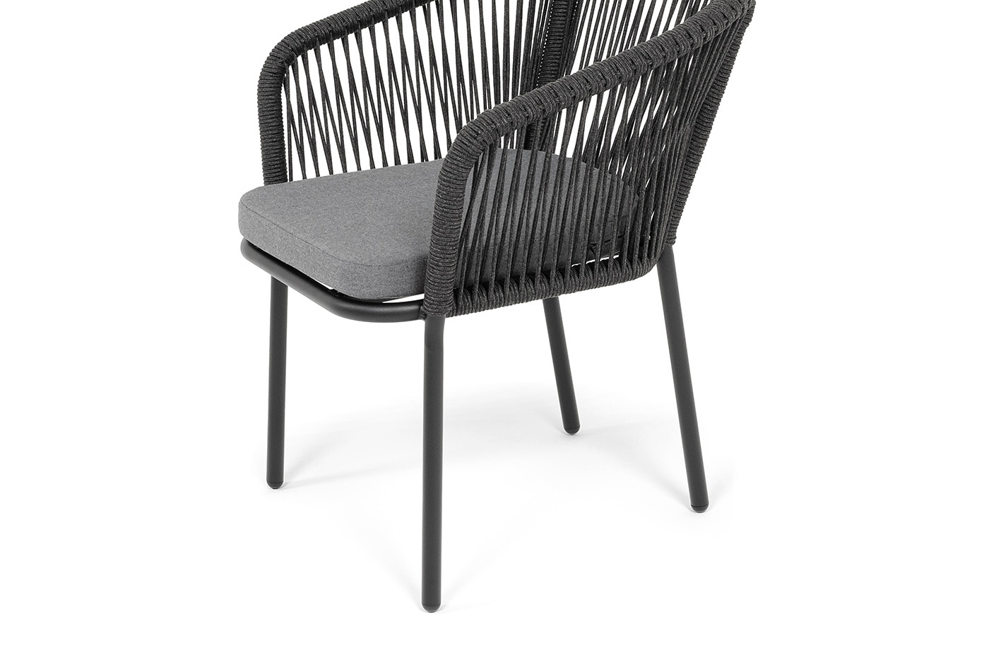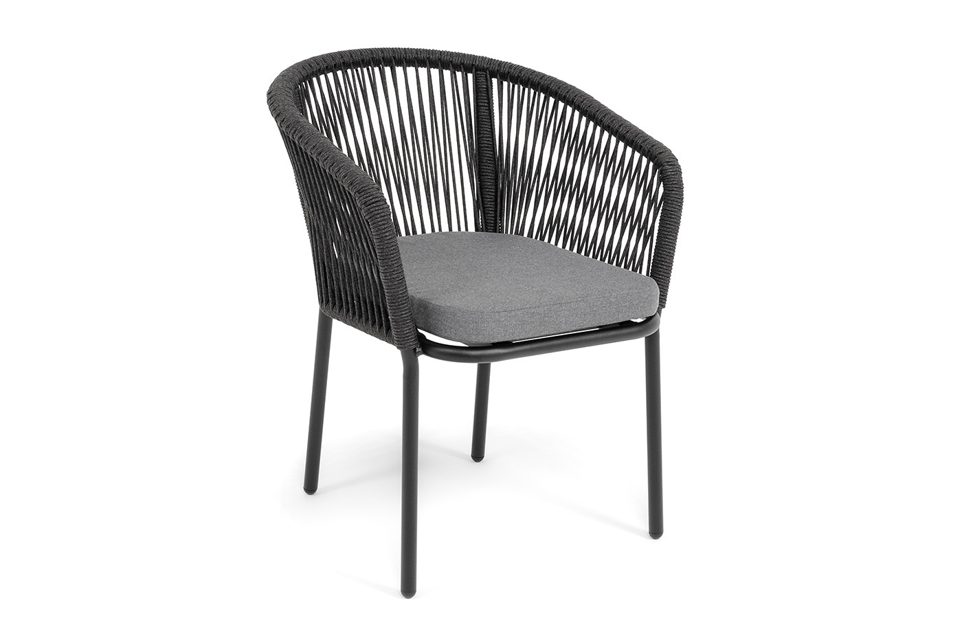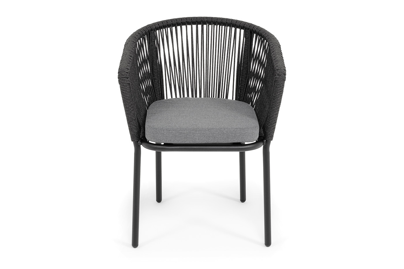 "Марсель" стул плетеный из роупа, каркас алюминий черный муар, роуп темно-серый круглый, ткань темно-серая 027