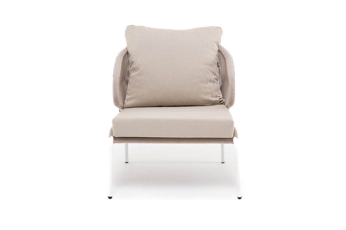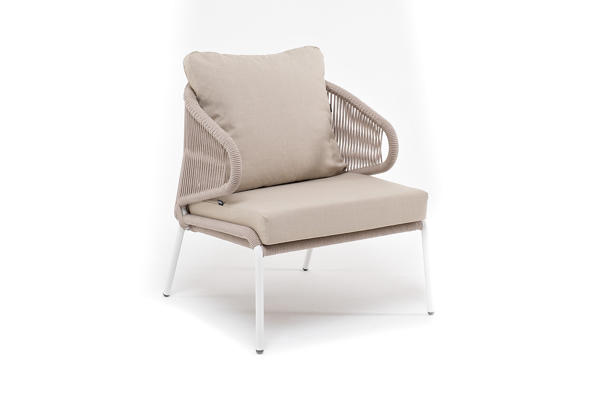 "Милан" кресло плетеное из роупа, каркас алюминий белый муар, роуп бежевый круглый, ткань бежевая 035