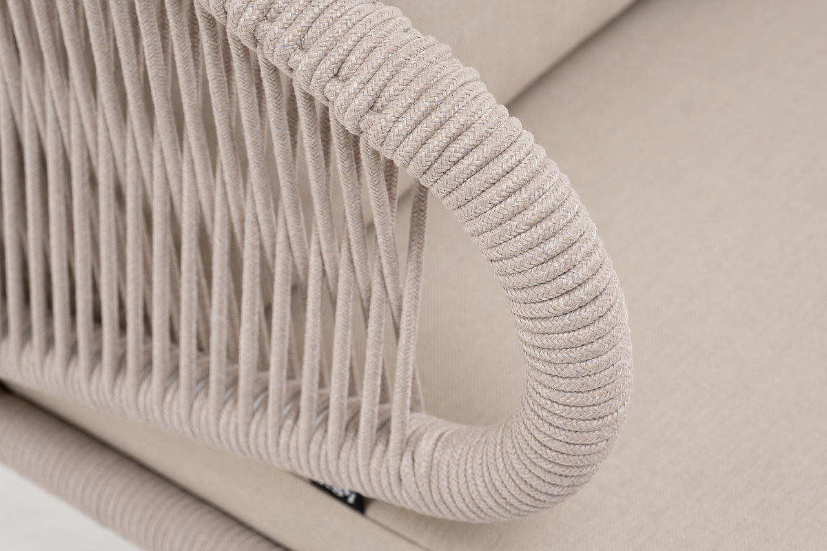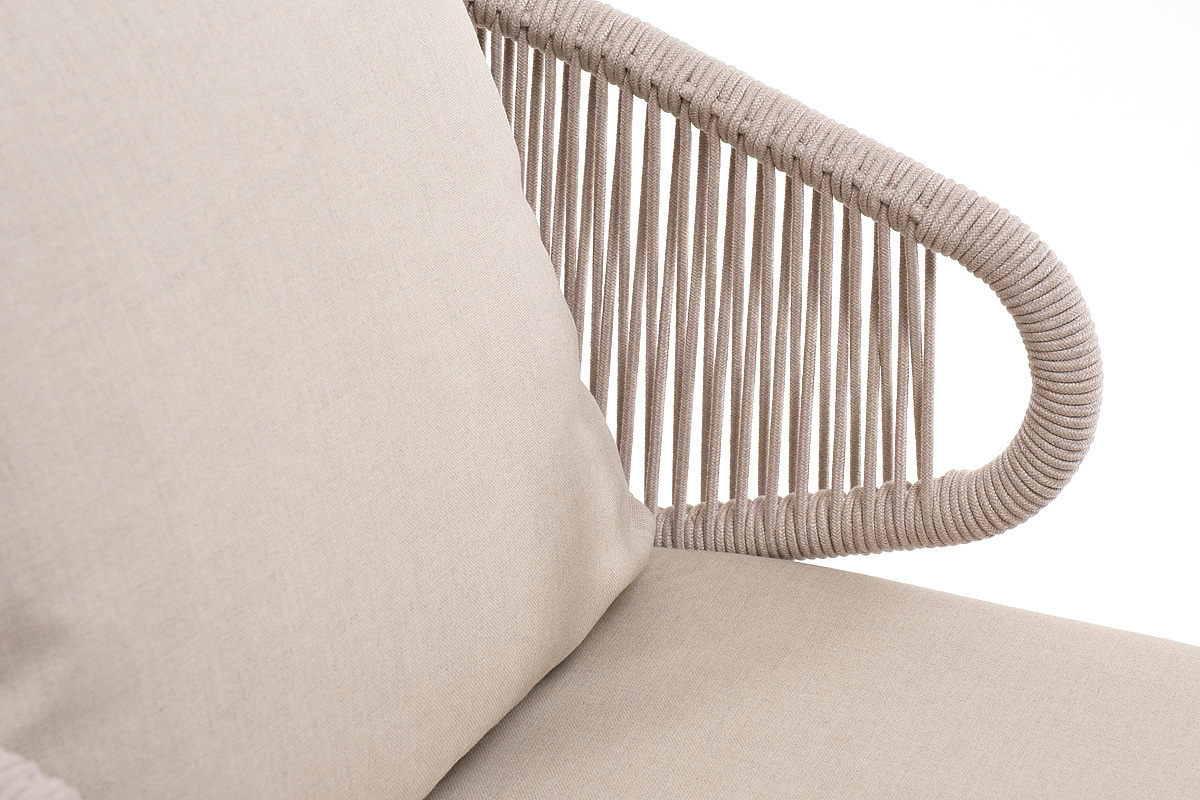 Плетеное кресло «Милан» для обустройства обеденной или лаунж-зоны. Изготовлен из алюминиевого каркаса, оплетенного вручную эластичными синтетическими лентами из высокопрочных полиэфирных волокон. Цвет каркаса - белый, оплетки – бежевый. Подушки состоят из наполнителя и съёмных чехлов, которые обработаны влагоотталкивающей пропиткой бежевого цвета. Чехол можно стирать в стиральной машине с использованием порошков. Размеры плетеного кресла: 700×650×830 мм.Бренд | 4SIS |