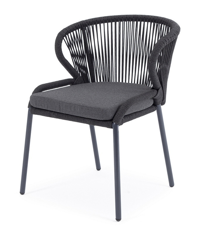 Стул «Милан» для обустройства обеденной или лаунж-зоны. Изготовлен из алюминиевого каркаса, оплетенного вручную эластичными синтетическими лентами из высокопрочных полиэфирных волокон (роуп круглый). Цвет каркаса темно-серый (RAL7024), оплетки - темно-серый. В комплект входит подушка со съёмным чехлом из 100%-го полиэстера с влагоотталкивающей пропиткой. Размеры плетеного стула: 600×660×795 мм.Бренд | 4SIS |