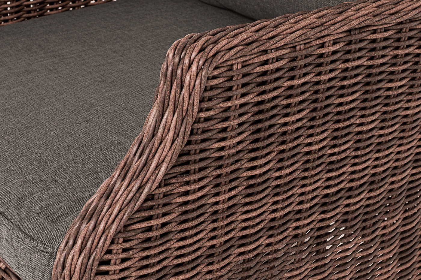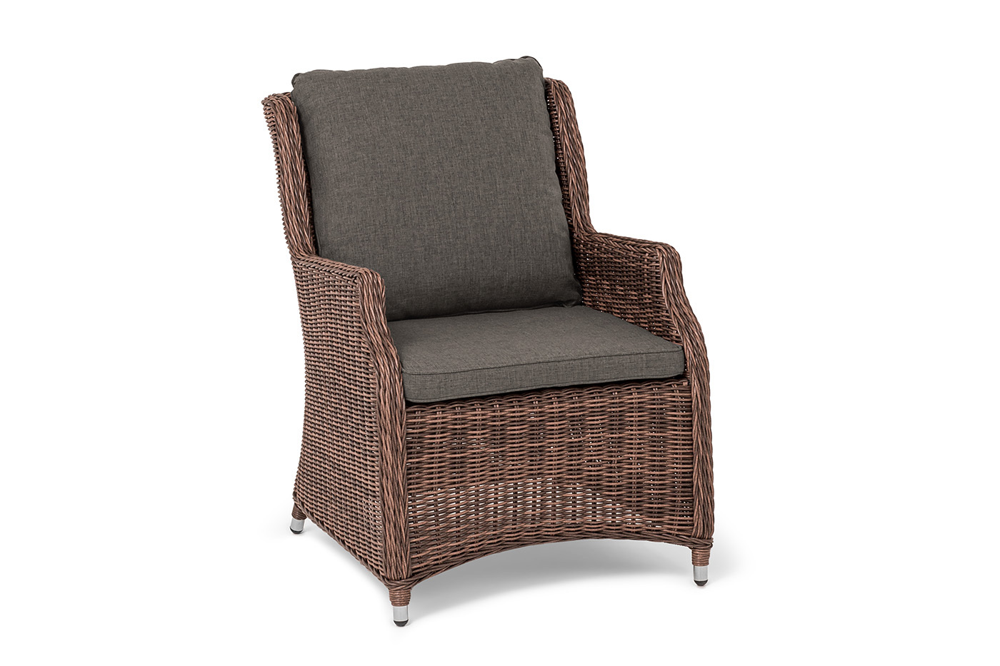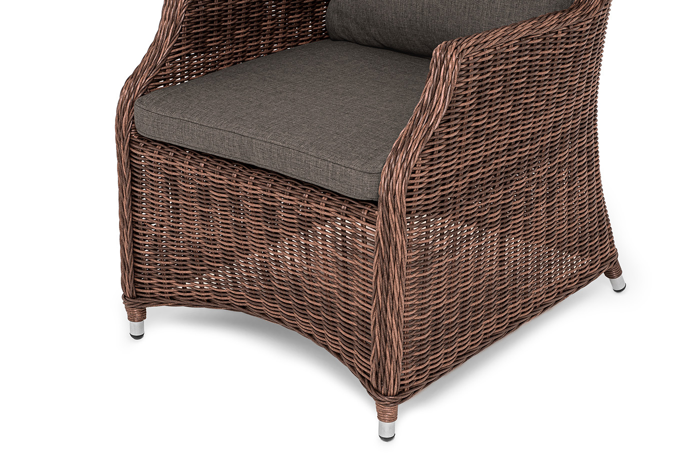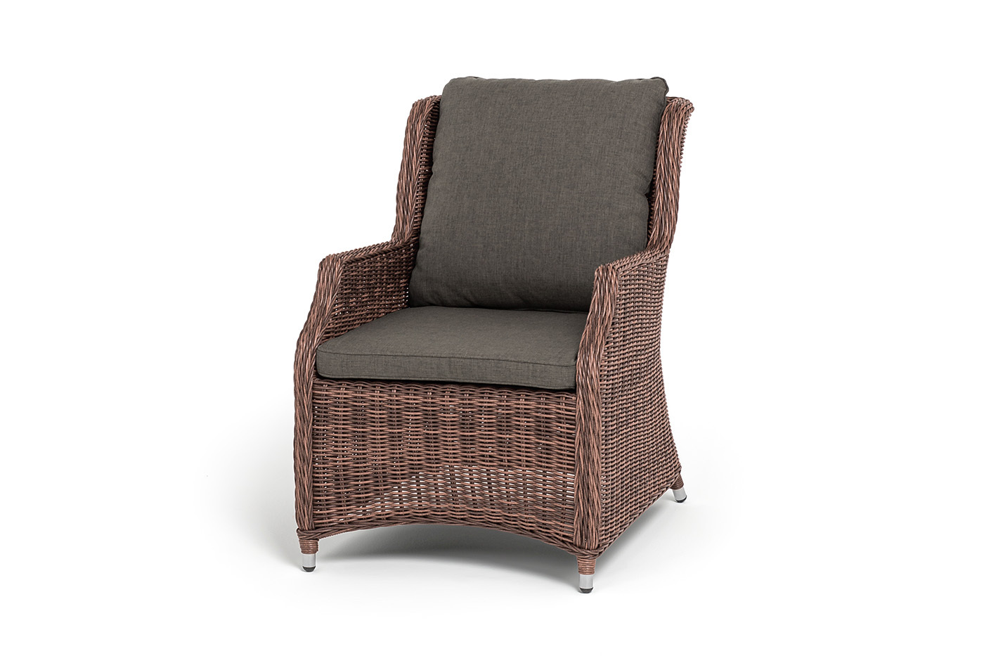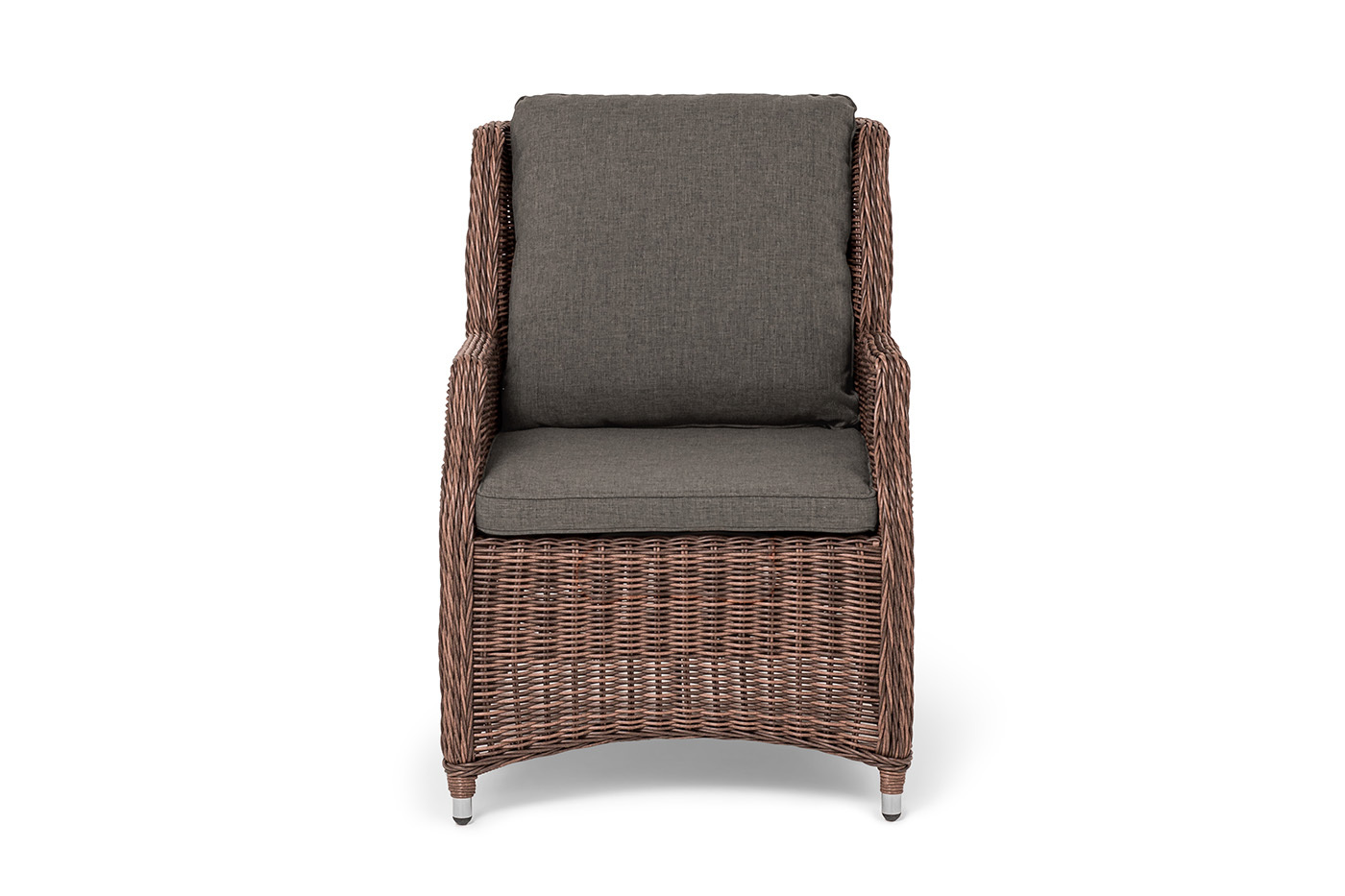 Стул «Неаполь» имеет практичные подлокотники для удобного размещения во время отдыха. Спинка и подлокотники имеют планые линии, благодаря своим закругленным формам. Каркас мебели сделан из алюминия. Присутствует ручное круглое плетение, при изготовлении которого используется искусственный ротанг. Представлено в коричневом цвете. Плетенный стул дополняют мягкие подушки. Они выполнены в сером оттенке. Пошиты изделия из плотного полиэстера 300гр/м2. Ткань предварительно обрабатывается влагоотталкивающей пропиткой. Размер модели – 650×900×920 мм.Бренд | 4SIS |