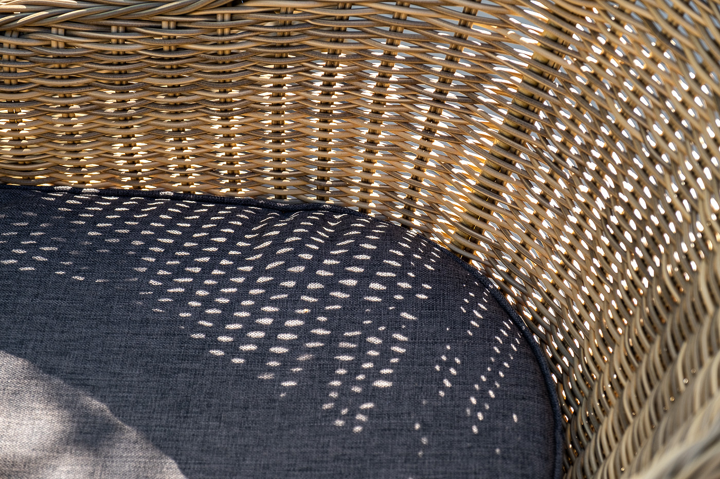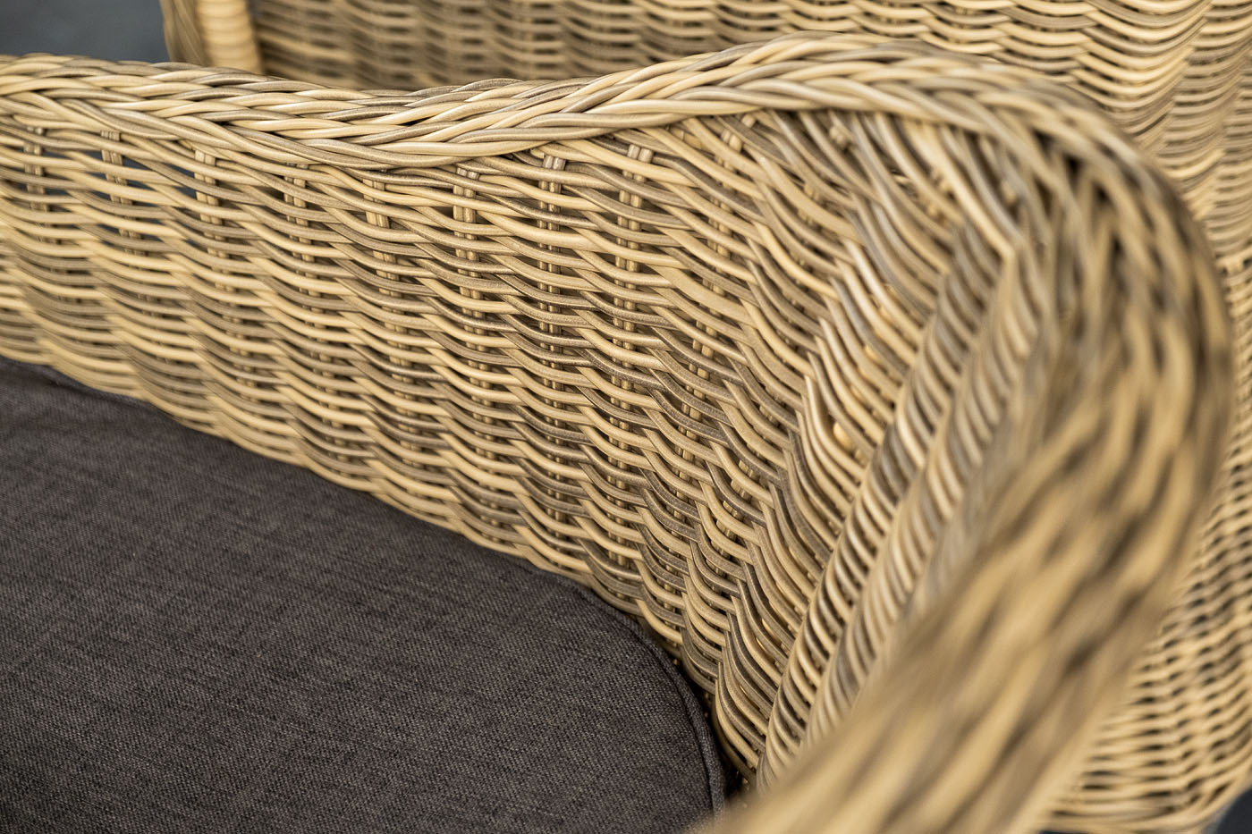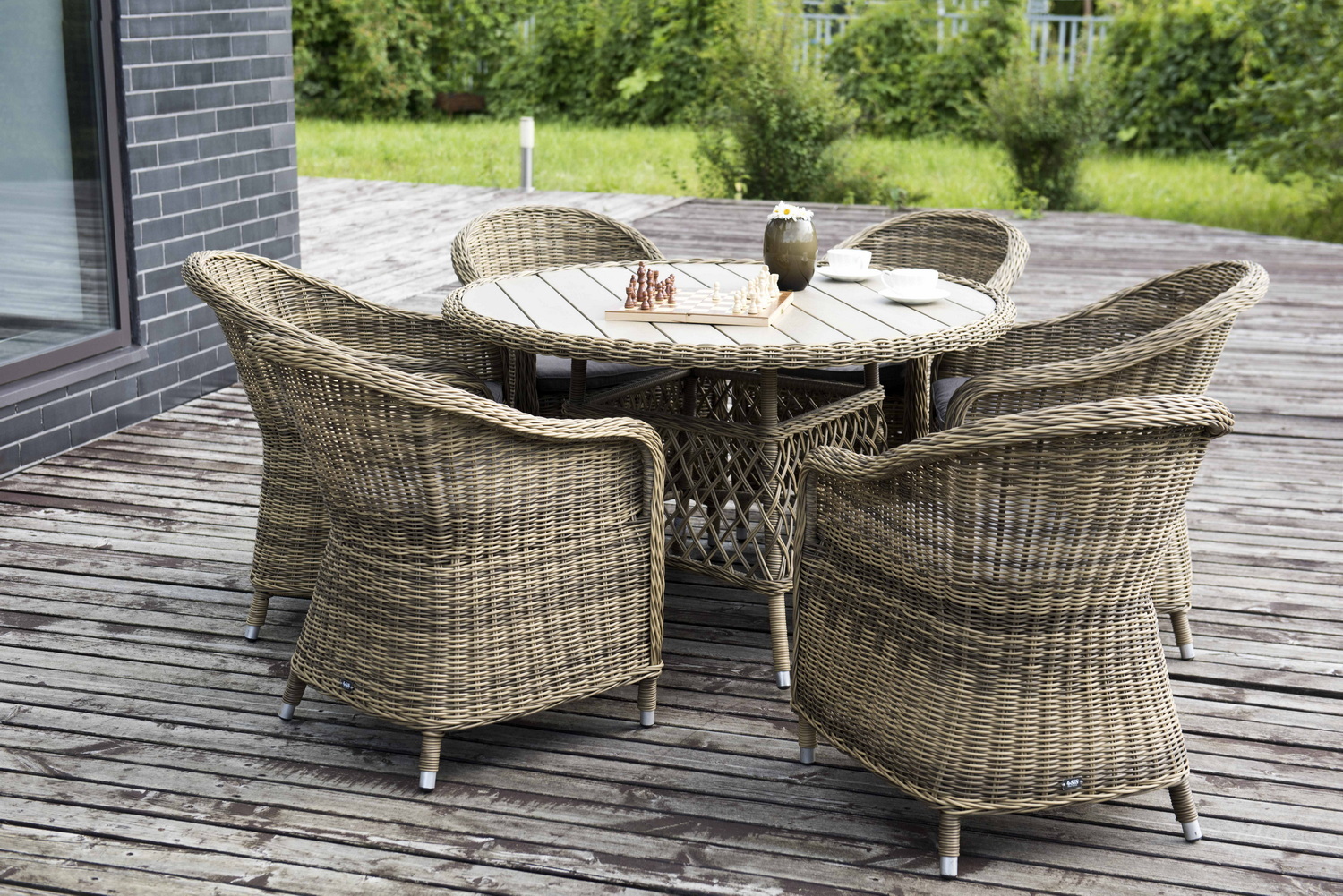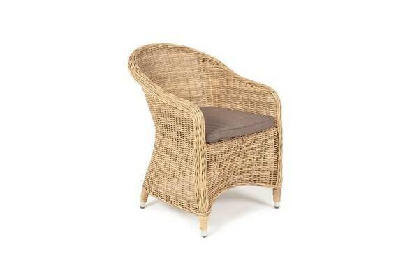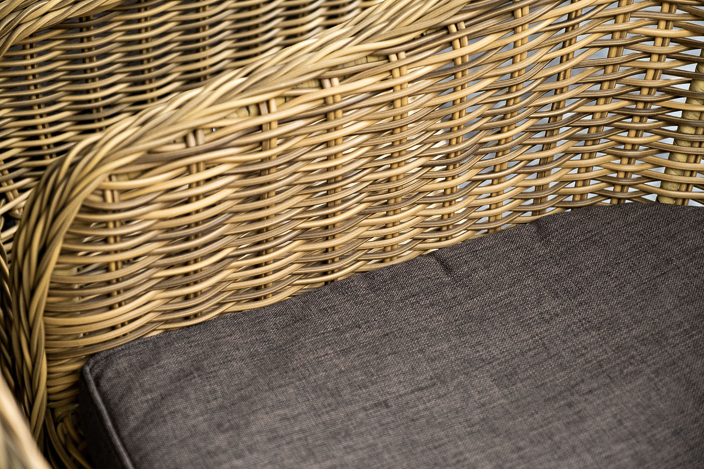 Кресло для сада из искусственного ротанга из коллекции «Равенна» станет поистине украшением вашего сада, веранды или террасы. Его можно использовать в помещении и на улице. Кресло изготовлено с помощью ручного плетения и выполнено из круглого искусственного ротанга соломенного цвета. Для укрепления конструкции использован алюминиевый каркас. Благодаря ему плетеное кресло остается легким, но прочным. Оно способно выдержать до 150 кг. Размеры: 570×680×810 мм. В комплект включена серая подушка со съёмным чехлом из полиэстера, который обработан влагоотталкивающими пропитками. Чехол можно стирать.Бренд | 4SIS |