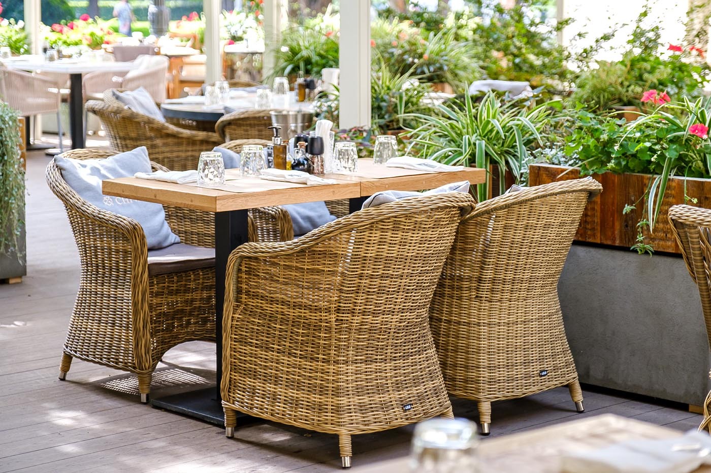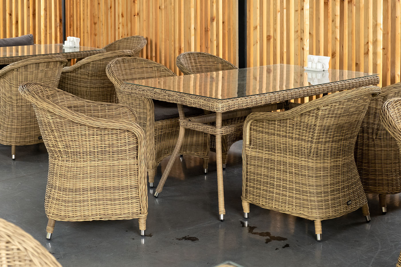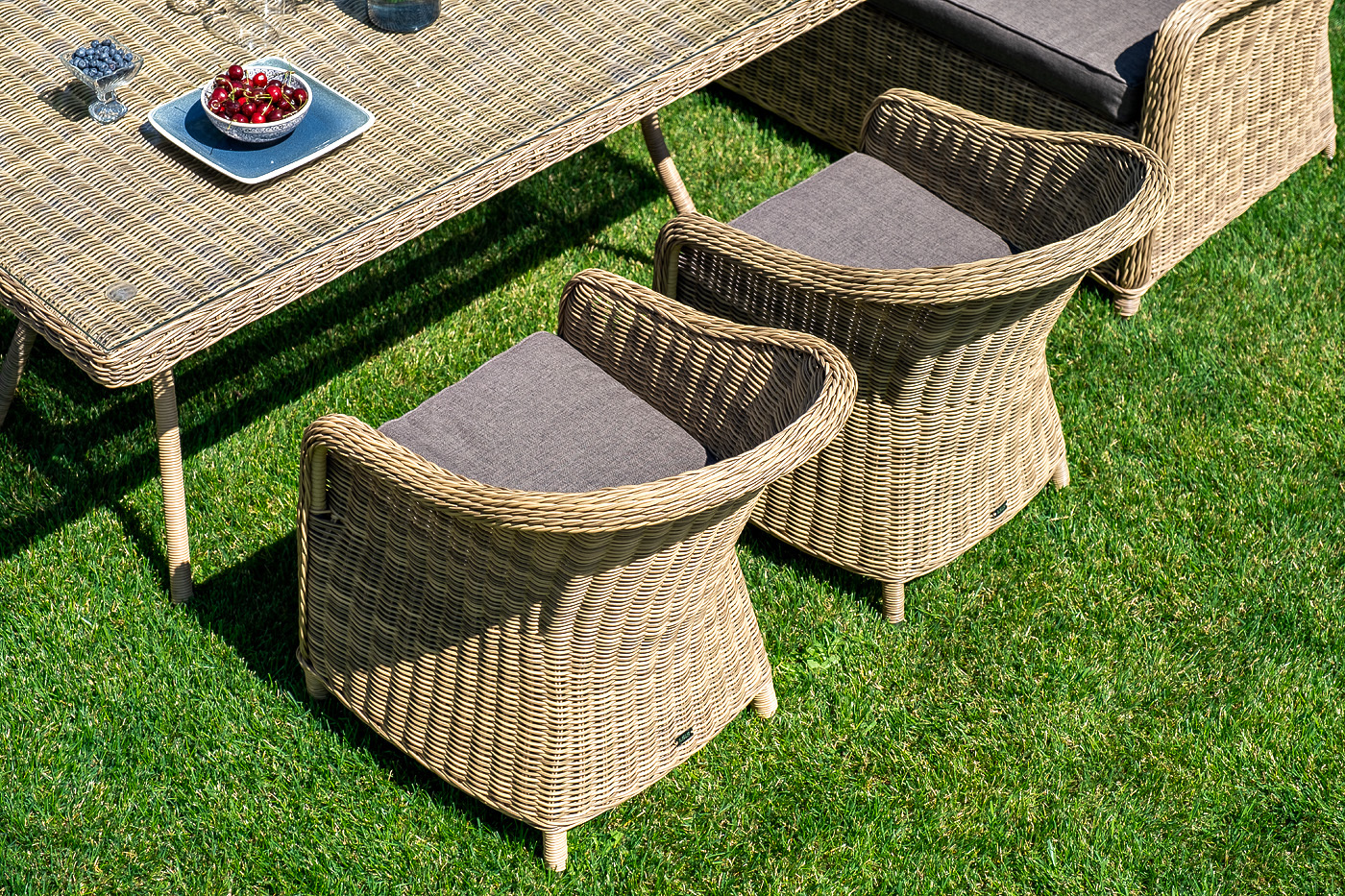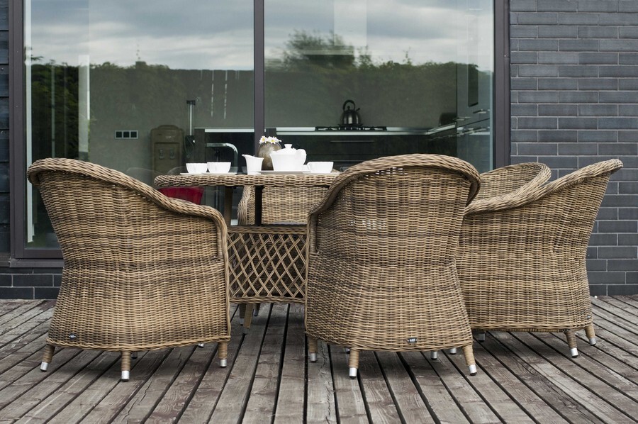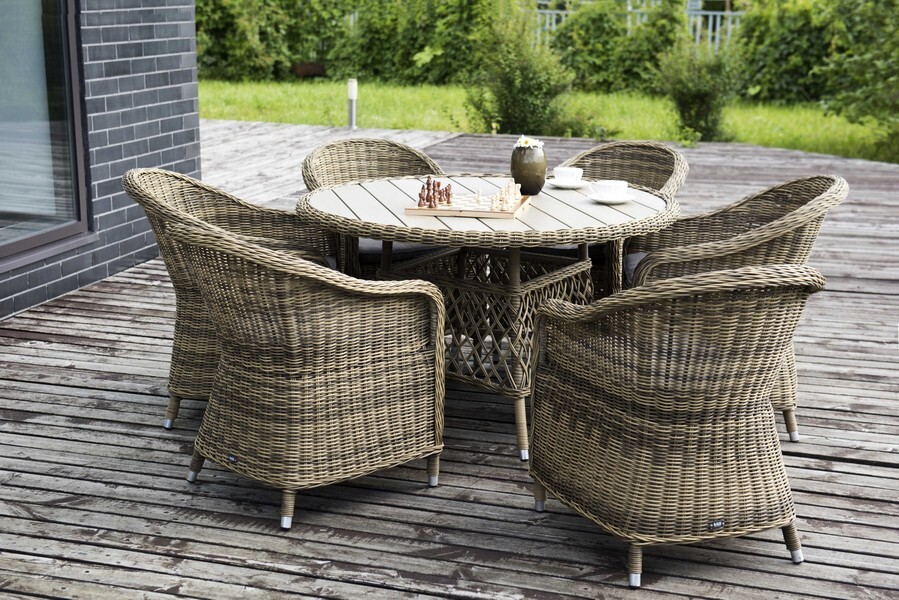 Кресло для сада из искусственного ротанга из коллекции «Равенна» станет поистине украшением вашего сада, веранды или террасы. Его можно использовать в помещении и на улице. Кресло изготовлено с помощью ручного плетения и выполнено из круглого искусственного ротанга соломенного цвета. Для укрепления конструкции использован алюминиевый каркас. Благодаря ему плетеное кресло остается легким, но прочным. Оно способно выдержать до 150 кг. Размеры: 570×680×810 мм. В комплект включена серая подушка со съёмным чехлом из полиэстера, который обработан влагоотталкивающими пропитками. Чехол можно стирать.Бренд | 4SIS |