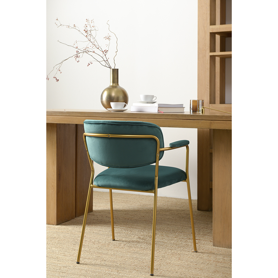 Стул Eirill с обивкой из мягкого, бархатистого велюра смотрится стильно и благородно. Материал приятный на ощупь, износостойкий и нетребовательный в уходе. Комфорт при сидении достигается за счет широкой, полукруглой спинки, глубокой посадки и высоких подлокотников с мягкими накладками. Плавные формы и декоративная строчка делают дизайн элегантным. Практичность и долговечность мебели обеспечивает прочный и надежный железный каркас. Модель органично вписывается в интерьер, оформленный в скандинавском стиле, эклектика, фьюжн, неоклассика и др.Материалы: 100%, полиэстер, фанера, железо, поролон. Размеры: 59x53x77 см. Высота сиденья: 48 см. Ширина сиденья: 45 см. Глубина сиденья: 44 см. Высота спинки: 30 см. Ширина спинки: 40 см. Максимальная нагрузка: 120 кг. Цвет: темно-зеленый.