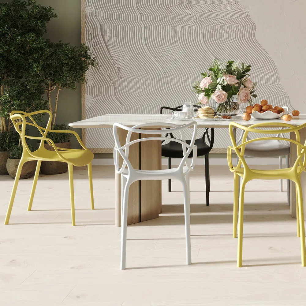 Варианты матовых отделок и металлизированного эффекта пластика расширяют возможность реализаций со стульями Masters в разных по стилю и дизайну помещениях