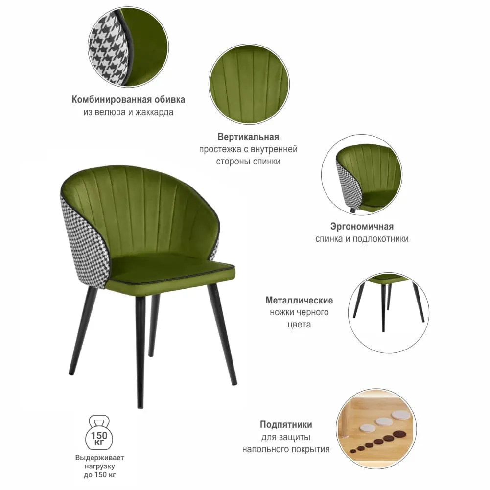 Стул на удобном металлическом сварном каркасе. Обивка в комбинации жаккарда и износостойкого мебельного велюра устойчива к истиранию. На внутренней стороне спинки имеется дополнительная вертикальная прострочка. Поставляется в разобранном виде. Ширина 59 см. Глубина 56 см. Высота 80,5 см. Вес стула 7,15 кг. Максимальная нагрузка 120 кг.Характеристики