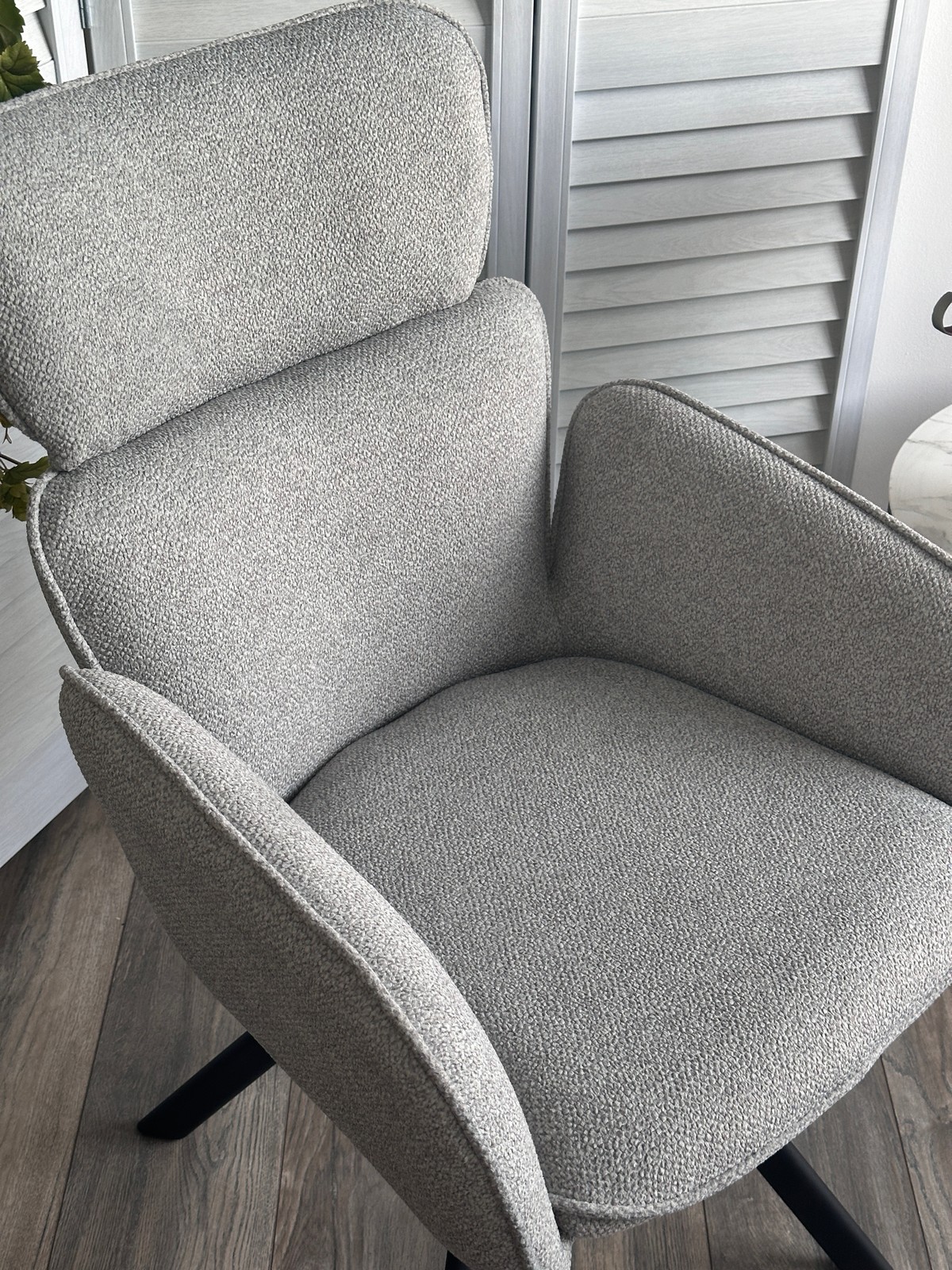 Обивка - букле. Ткань очень приятная на ощупь, легко чистится, не выгорает, отсутствие катышков.