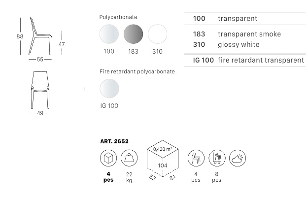 Пластиковый стулVanity из поликарбоната от дизайнеров Arter & Citton.Идеальный стул для любого типа обстановки, отличающийся свежим и современным дизайном. Модель характеризуется слегка вогнутой спинкой и сочетает в себе cовременную гармонию линий с оригинальной конструкционной способностью, которая позволяет штабелирование. Особенности: Стул полностью выполнен изпрочного поликарбоната,пригодного для повторного использования. Возможность штабелирования до 4 шт. для максимального удобства хранения. Данная модель предназначена для использования на летних верандах, террасах, фудкортах, а такжево внутреннем интерьере кафе, ресторанов. Открыть технические характеристики. Информация по уходу:прозрачные стулья можно протирать тряпкой из микрофибры, допускается применение нейтрального мыльного раствора. Запрещается использовать спиртосодержащие или ацетоносодержащие (а также им подобные) средства.Характеристики