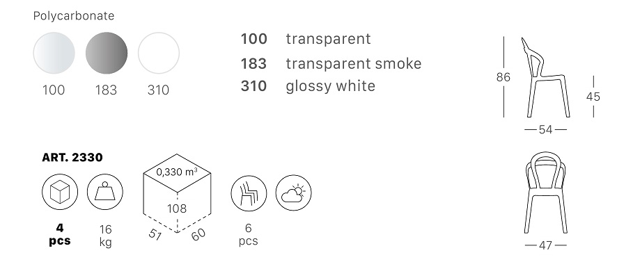 Пластиковый стул Titi из перерабатываемого поликарбоната от дизайнера Roberto Semprini.Благодаря элегантному стилю модель идеально впишется как в самые изысканные дома, но также и в любые интерьеры сферы Contract. Особенности: Стул выполнен из перерабатываемого поликарбоната. Возможность штабелирования до 6 шт. обеспечивает компактность и мобильность стульев. Данная модель предназначенадля использования на летних площадках, террасах, фудкортах, а также во внутреннем интерьере кафе, ресторанов. Открыть технические характеристики. Информация по уходу:прозрачные кресла можно протирать тряпкой из микрофибры, допускается применение нейтрального мыльного раствора. Запрещается использовать спиртосодержащие или ацетоносодержащие (а также им подобные) средства.Характеристики