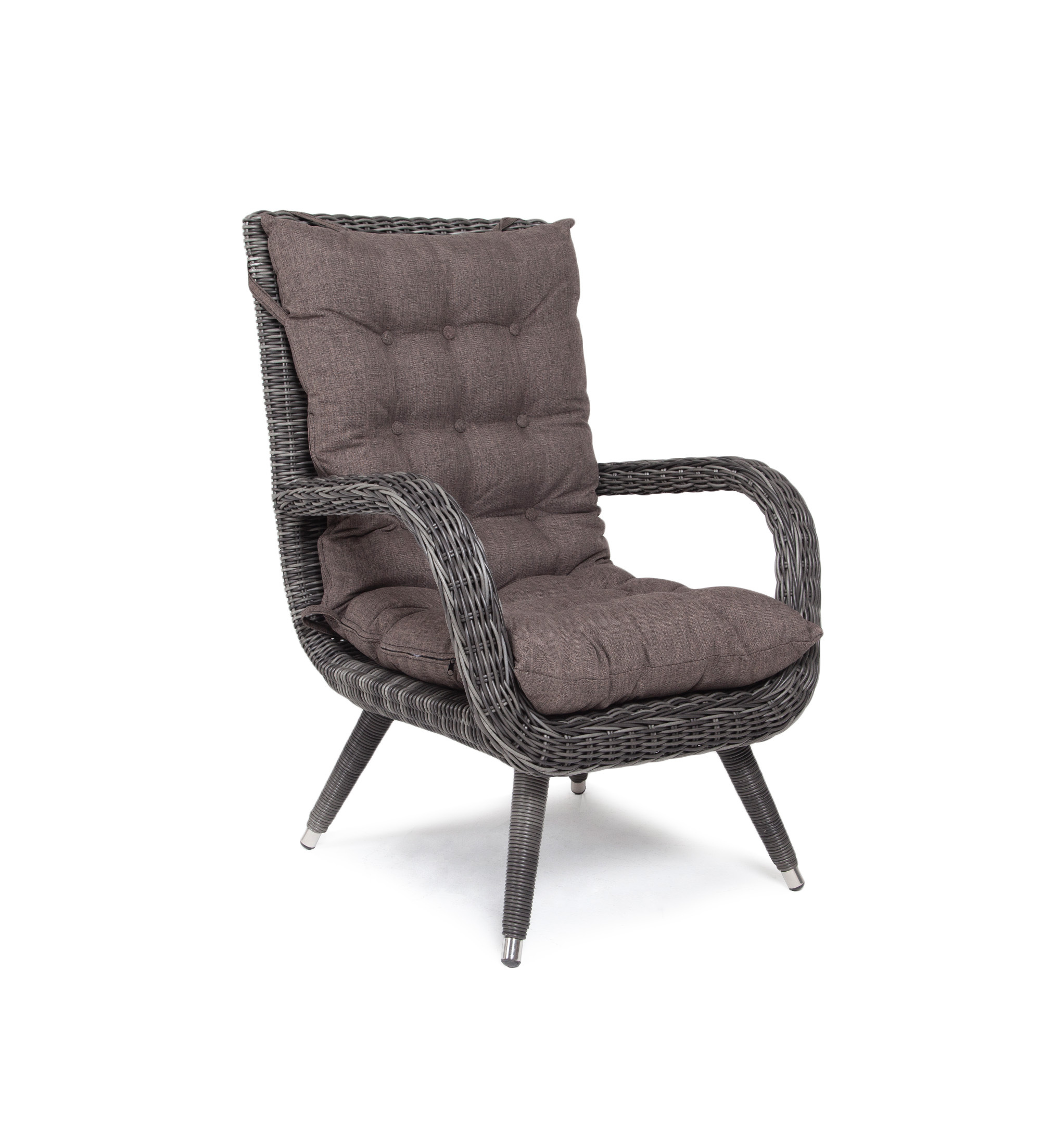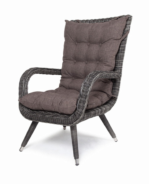 Кресло «Толедо» имеет высокую спинку и удобные закругленные подлокотники. При использовании в ресторанах такая конструкция не требует дополнительного зонирования пространства. Размер модели – 690×810×990 мм. При изготовлении ее каркаса используется прочный алюминий с высокой износостойкостью. Имеет ручное плетение, которое выполнено из искусственного ротанга в цвете графит. Садовое кресло дополнено мягкими подушками для комфортного размещения. Они выполнены в сером цвете. При их пошиве используется полиэстер с плотностью 300гр/м2. Влагоотталкивающая пропитка усиливает защитные свойства материала.Бренд | 4SIS |