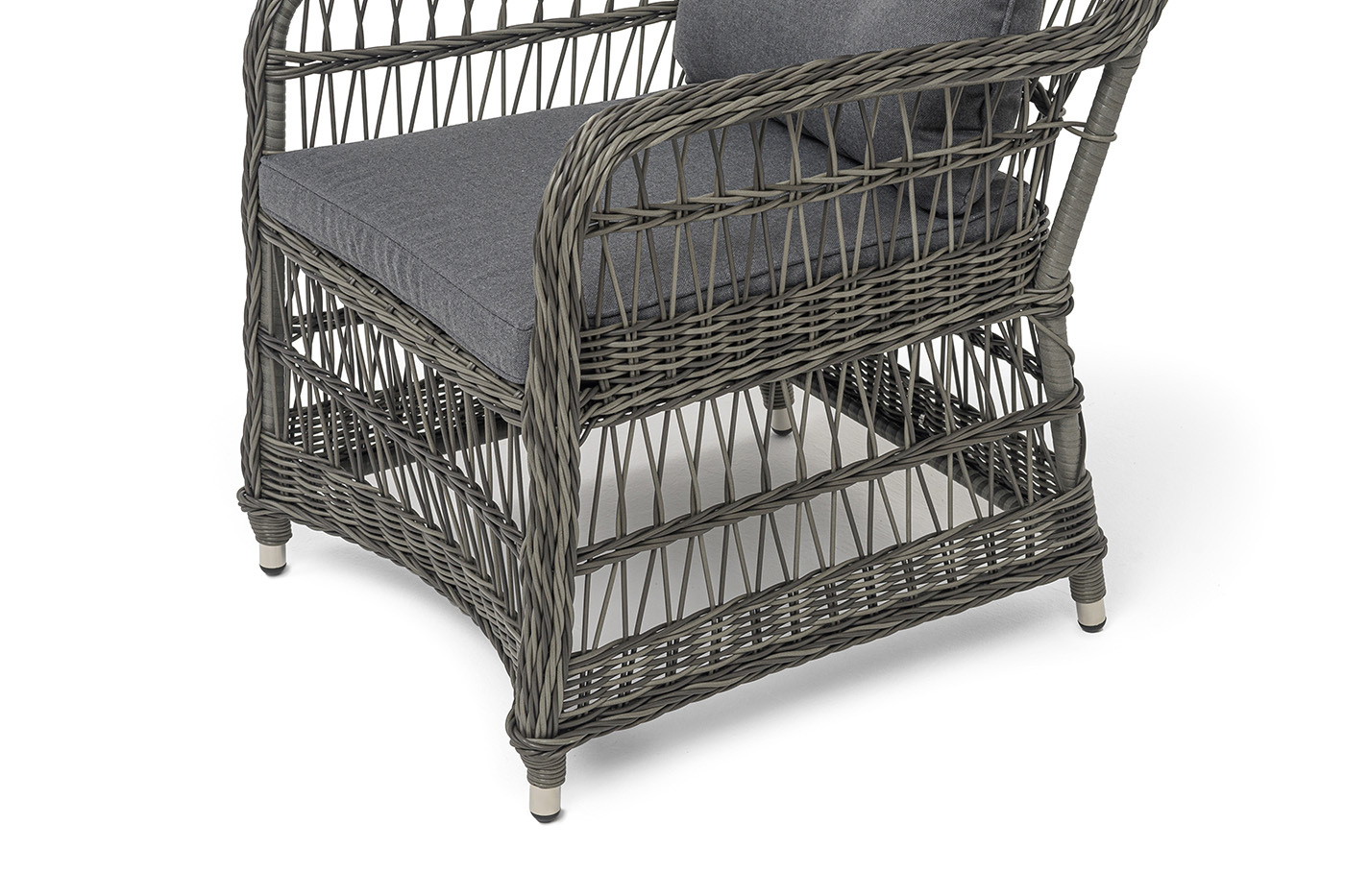 Кресло «Цесена» имеет практичные подлокотники для удобного размещения во время отдыха. Алюминиевый каркас находится в основе мебели. Он характеризуется устойчивостью и высокой прочностью. Задекорирован ручной круглой оплеткой, которая сделана из искусственного ротанга. Представлена в графитовом оттенке. Садовое кресло располагает двумя мягкими подушками, которые идут в комплекте. Они выполнены в сером цвете. Полиэстер высокого качества используется при пошиве тканевых изделий. Его плотность 300гр/м2. Ткань обрабатывается влагоотталкивающей пропиткой. Размер модели – 620×800×910 мм.Бренд | 4SIS |