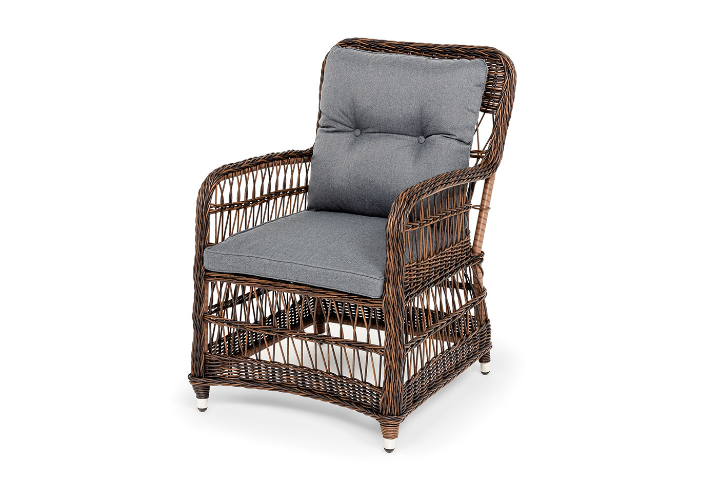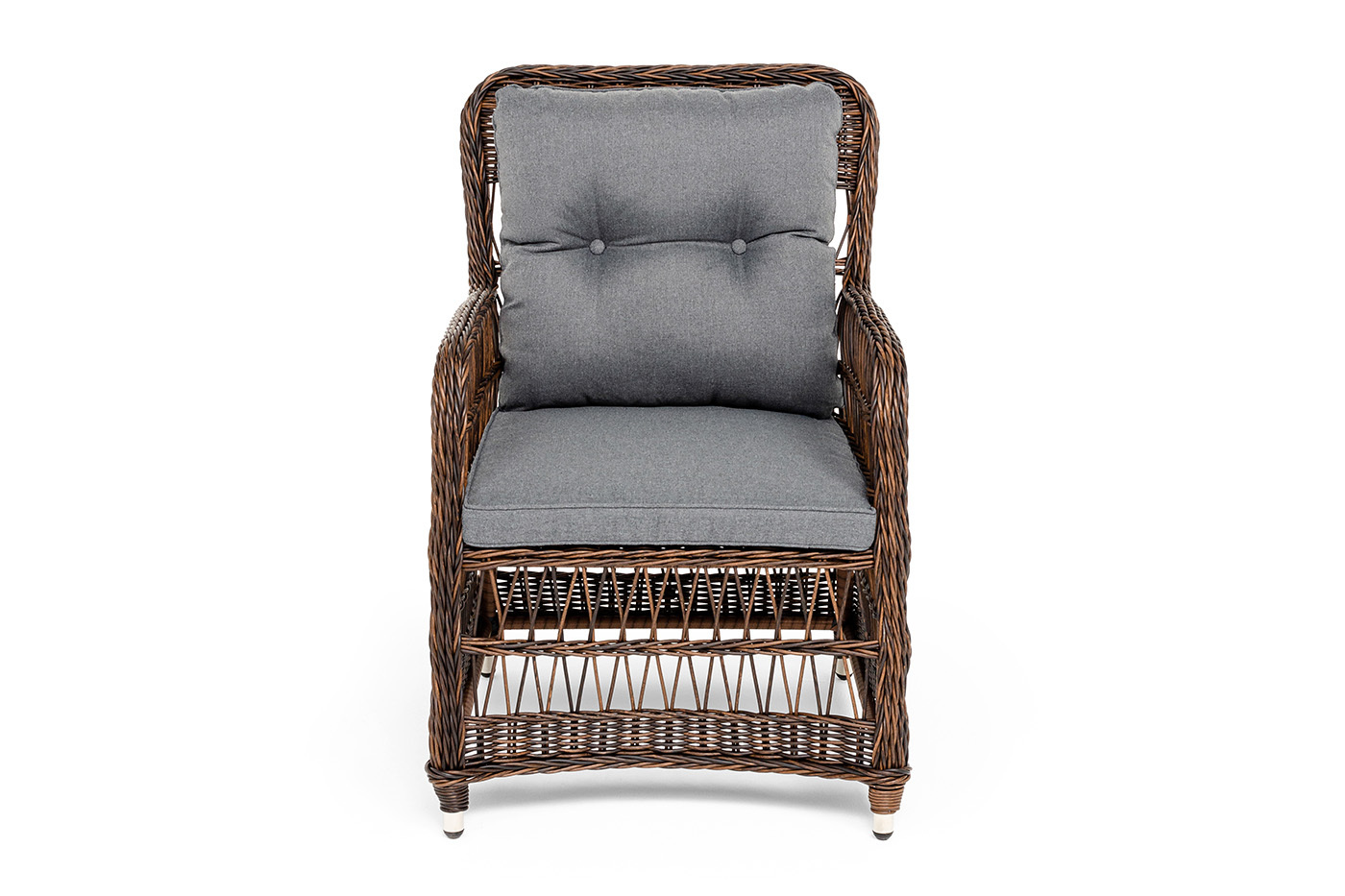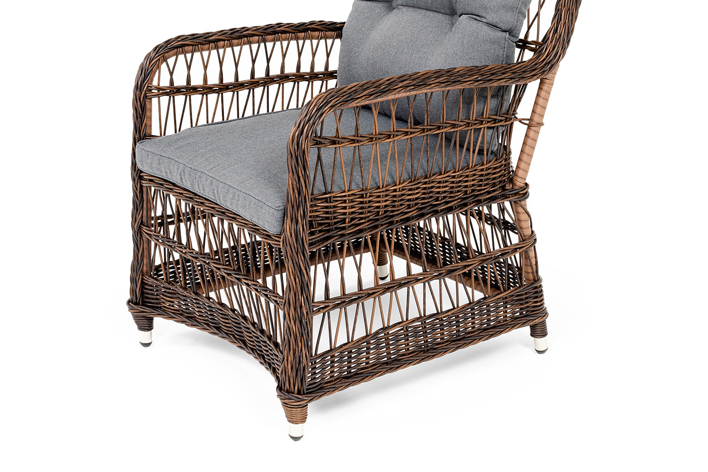 Кресло «Цесена» имеет практичные подлокотники для удобного размещения во время отдыха. Алюминиевый каркас находится в основе мебели. Он характеризуется устойчивостью и высокой прочностью. Задекорирован ручной круглой оплеткой, которая сделана из искусственного ротанга. Представлена в коричневом оттенке. Садовое кресло располагает двумя мягкими подушками, которые идут в комплекте. Они выполнены в сером цвете. Полиэстер высокого качества используется при пошиве тканевых изделий. Его плотность 300гр/м2. Ткань обрабатывается влагоотталкивающей пропиткой. Размер модели – 620×800×910 мм.Бренд | 4SIS |