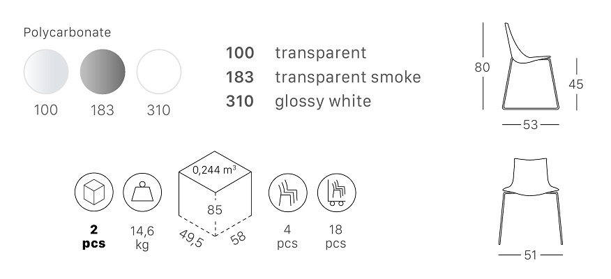 Пластиковый стул Zebra Antishockс корпусом из поликарбоната от дизайнераLuisa Battaglia.Идеальный стул для любого типа обстановки, отличающийся свежим и современным дизайном. Особенности: Каркас выполнен в виде полозьев из хромированной стальной трубы диаметром 11мм. Корпус выполнен из прочногополикарбоната. Возможность штабелирования до 4 шт. для максимального удобства хранения. Данный стул предназначен для использования во внутреннем интерьере кафе, ресторанов. Открыть технические характеристики. Информация по уходу:прозрачные стулья можно протирать тряпкой из микрофибры, допускается применение нейтрального мыльного раствора. Запрещается использовать спиртосодержащие или ацетоносодержащие (а также им подобные) средства.Характеристики