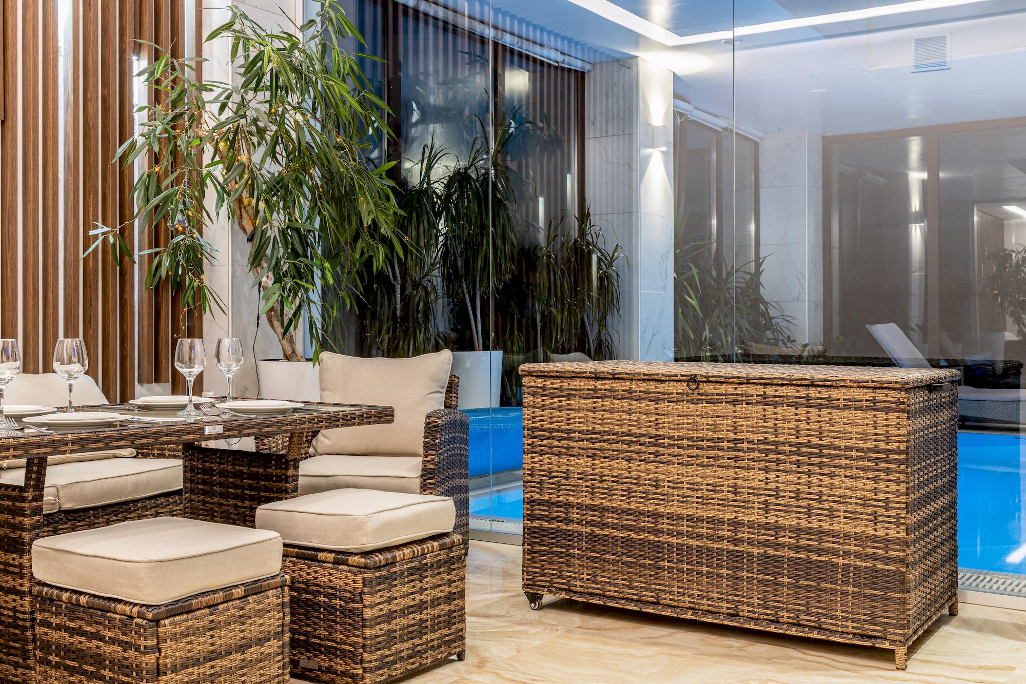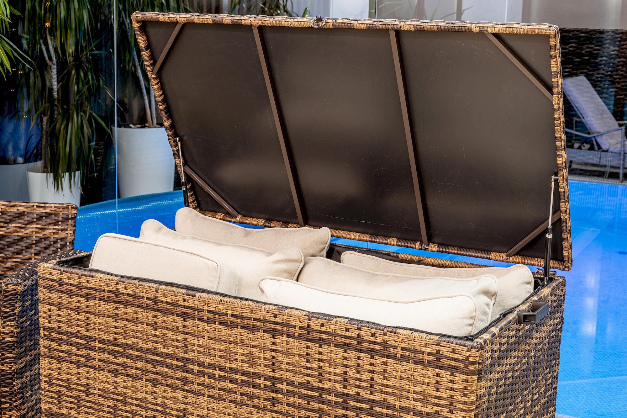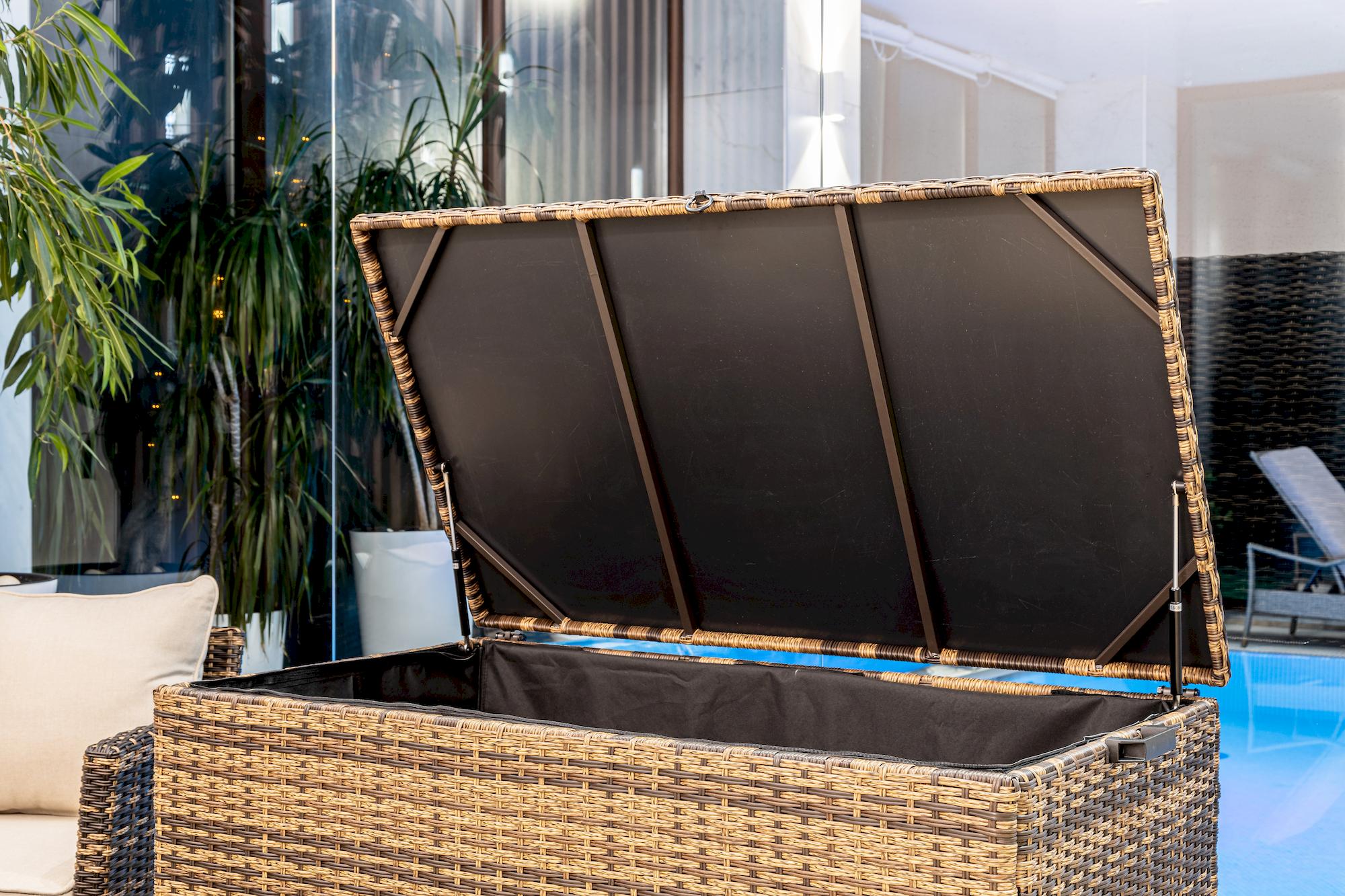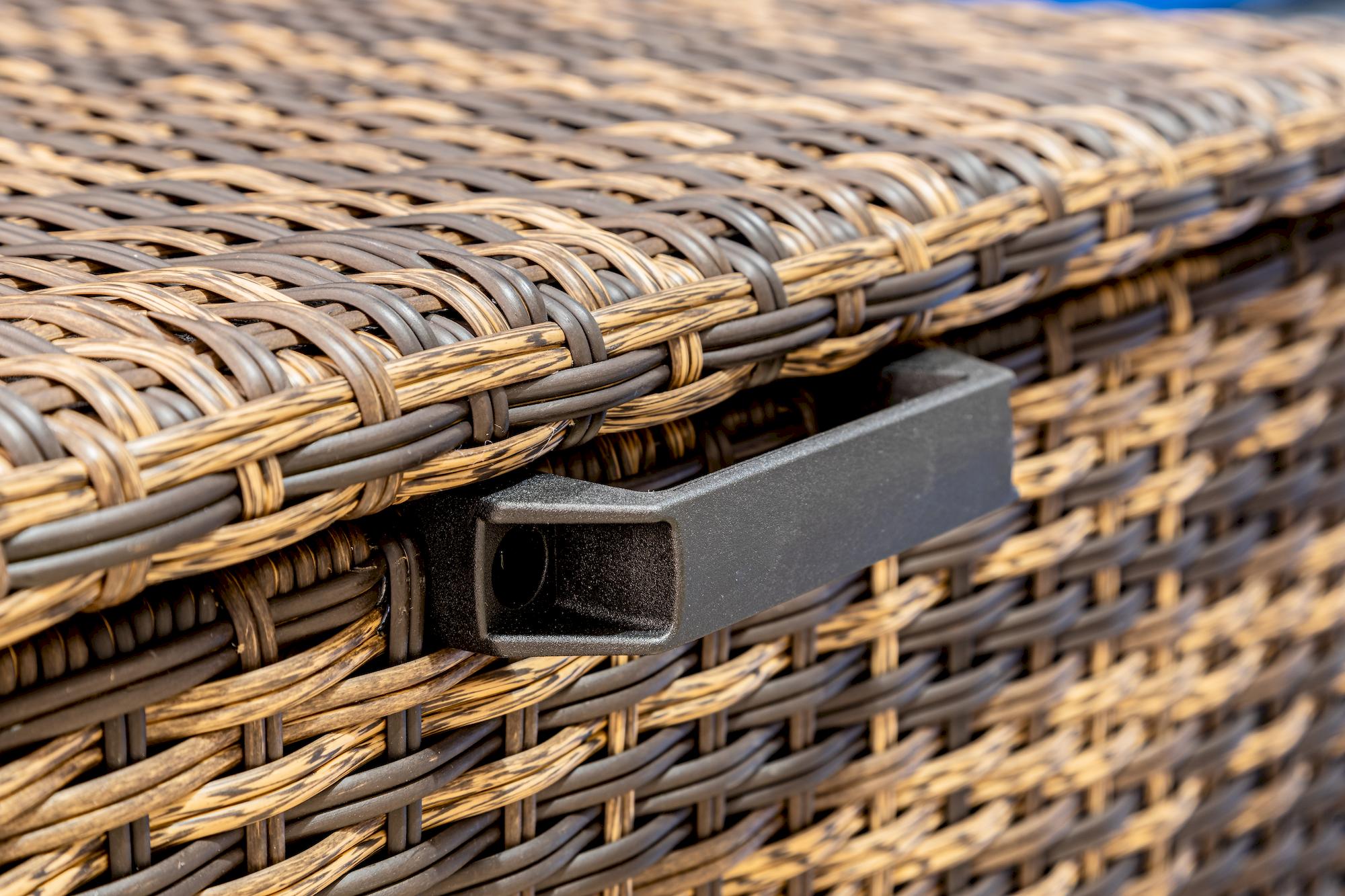 Габариты: Сундук – 120х70х78 см Материалы: Материал - искусственный ротанг (ручного плетения) Материал каркаса – сталь Механизм - газлифт Подложка - есть Колёсики - есть Ручка - есть Цвет - Коричневый Дополнительная информация: Температурный режим - от -50?C до +50?C Сочетается с комплектами бренда ROYAL FAMILY в коричневом цвете Накладки на ножки - да (пластиковые) Категория ротанга - первичная Гарантия и эксплуатация: Гарантийный срок - 1 год Эксплуатационный срок - 10 лет Страна производитель - КитайХарактеристики