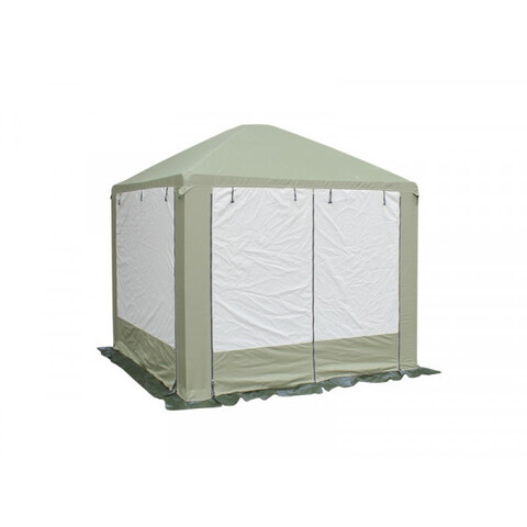 Тент такого шатра сшит из ткани, устойчивой к влаге (водоотталкивающая пропитка 2000 мм. водного столба). Все швы проклеены. Он отлично натягивается на каркас при помощи строп и молний. Для большего комфорта можно поднять глухие стенки, оставив только противомоскитные.