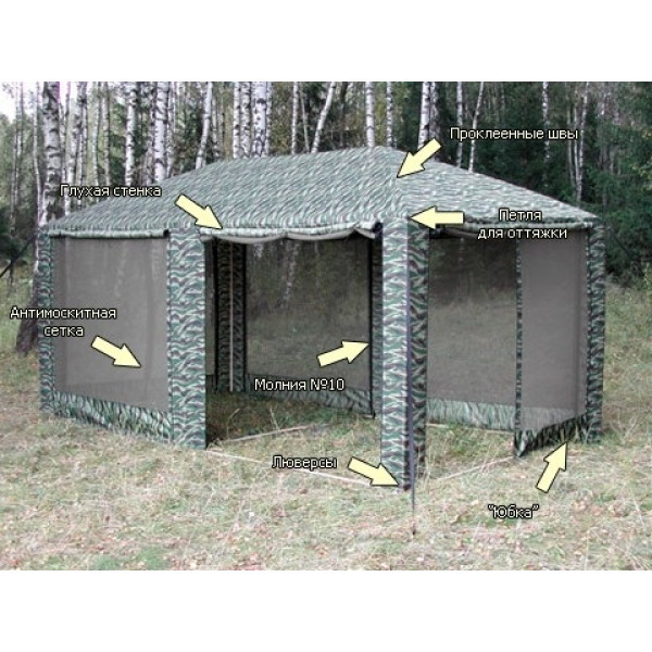Тент: ткань oxford 300D PU 2000 (водостойкость 2000 мм водяного столба) устойчивой к воздействию солнечных лучей. Швы крыши проклеены.