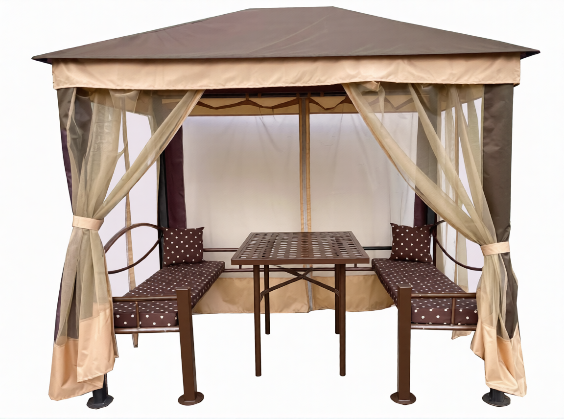 Габариты изделия (Ш/ГхДхВ) : 255х175х235 Цвет каркаса : коричневый Материал каркаса : сталь Покрытие : краска порошковая полимерная Цвет поверхности : коричневый, горошек Материал поверхности : поликоттон Дополнительно : Шатер беседка, 6 ти местный. Лавочки- 2 шт единая конструкция шатра, сиденье сварная сетка: 1500*500*80,толщина мягкого элемента - 80 мм, наполнитель мягкого элемента hollcon/forplit, стол- металл окрашенный 1200*800*800. Крыша Oxford 420D. Защита от насекомых: пологи из специальной сетки, м/э Страна производства : БЕЛАРУСЬХарактеристики