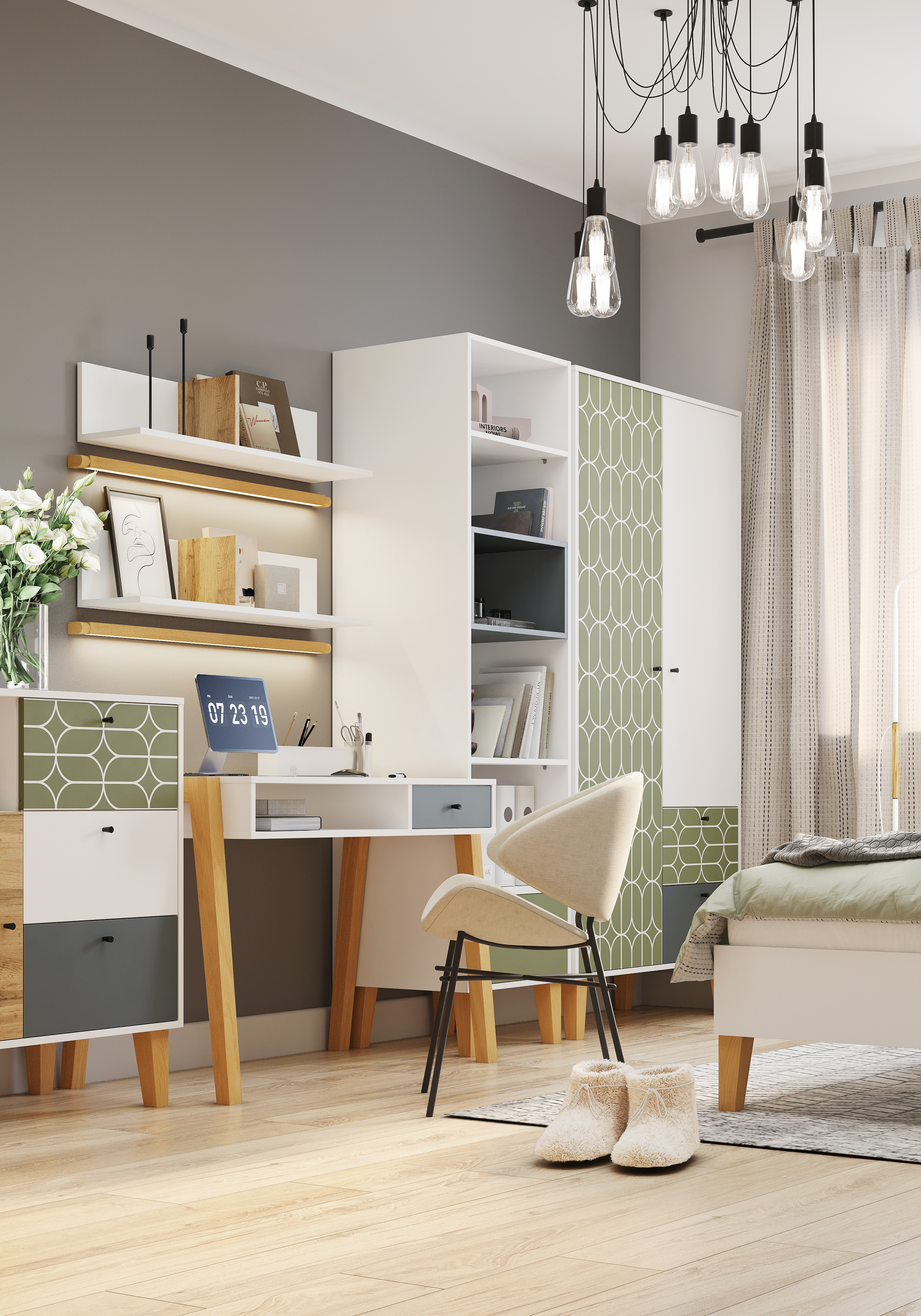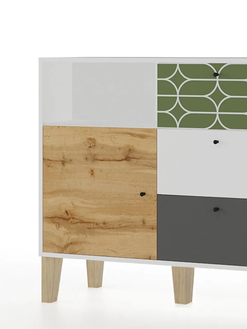 Овалы". Корпус и внутреннее наполнение - Белые, Фасады: Дуб Вотан, Олива с УФ-печатью "Овалы", Белый, Темно-серый. ЛДСП 16 мм, Опора сращенный массив Березы, высота - 18 см (4 шт) Направляющие телескопические, Ручка-кнопка черная пластик, Задняя стенка и дно ящиков ХДФ врезная белая, Петля вкладная с доводчиком."Характеристики