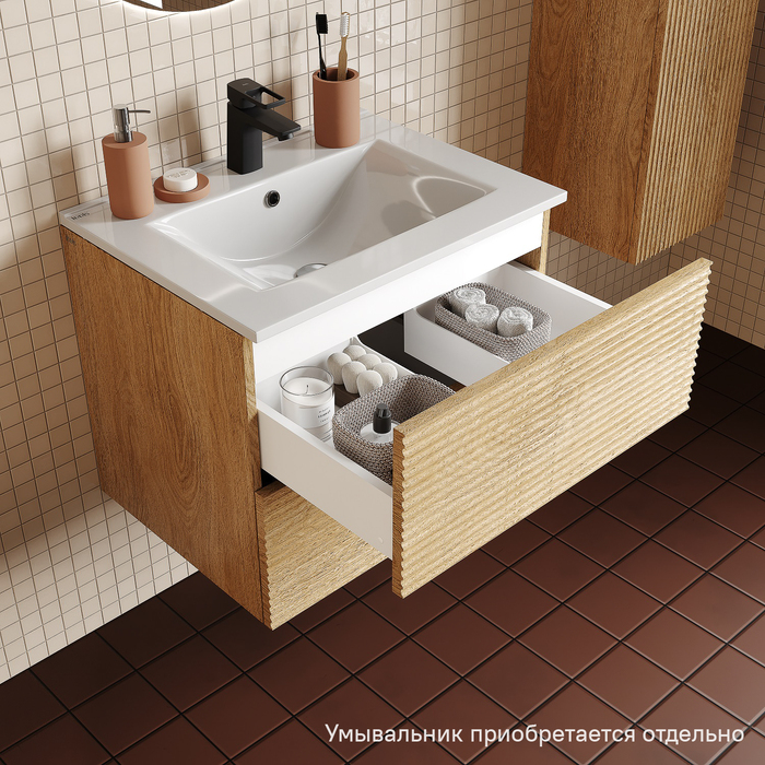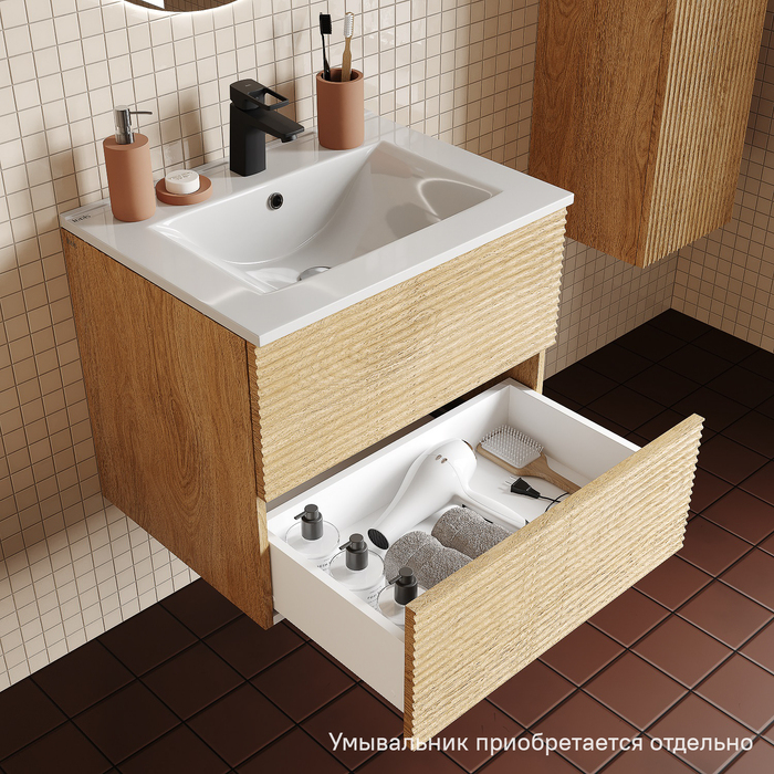Компактная подвесная тумба для ванной комнаты Bild с ящиками – красивый дизайн со структурной горизонтальной фрезеровкой в сочетании с теплым оттенком дуба, удобством и практичностью. Умывальник приобретается отдельно (подходит умывальник IDDIS® арт. 0136000i28). - Материал фасадов – МДФ с покрытием ПВХ-пленкой. Она разработана для использования в помещениях с высокой влажностью и сохранит первоначальный вид мебели надолго (при должном уходе). Материал боковин – ЛДСП. - Два ящика с направляющими скрытого монтажа. Фурнитура рассчитана на более 10 лет исправной работы. - Современный механизм открытия Push-to-Open – открывается нажатием на фасад. - В комплекте крепеж для монтажа тумбы. - Сифон приобретается отдельно. Подходят сифоны IDDIS® арт. 900BVG0010VD, 902BV750VD, 900B000010VD (выпуск приобретается отдельно). Гарантия на мебель IDDIS® – 3 года, на умывальник – 5 лет. (с) Авторский текст, июнь 2024 г.Инструкции