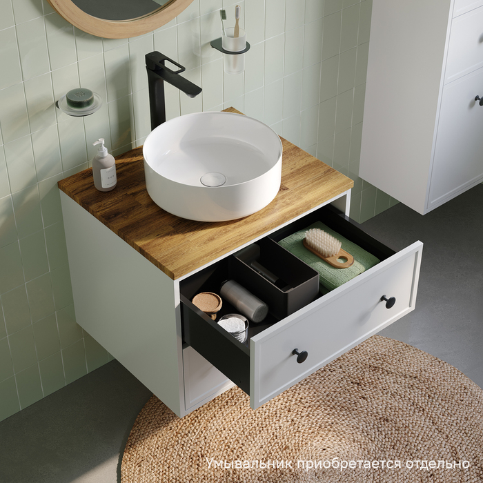 Чёрные матовые ручки, накладной умывальник, ящики с механизмом плавного доведения