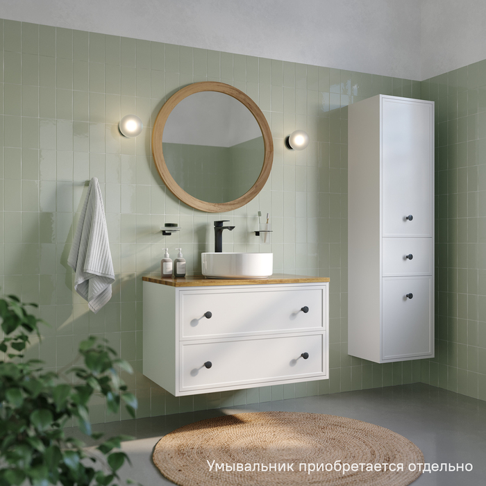 Чёрные матовые ручки, накладной умывальник, ящики с механизмом плавного доведения