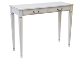Классический консольный стол для оформления интерьера гостиной, прихожей, спальни Конусообразные ножки с лаконичной гравировкой выполнены из массива бука Все гравировки покрыты патиной в цвет золота, что еще больше подчеркивает их рисунок Поверхность консоли шпонирована натуральным дубом, два выдвижных ящика Надежная классическая конструкция, компактная упаковка, выверенные габаритные размеры Предметы интерьера серии "Васко" консоль, журнальный стол, зеркало, банкетка, костюмная вешалка отлично дополняют друг друга создавая интерьер в стиле неоклассика ___ Стол консольного типа удобен тогда, когда вы точно определили его место в интерьере и не собираетесь его перемещать. Часто консоль используется для размещения над ней зеркала, либо картины. Консоль - достаточно компактный предмет интерьера. Несмотря на это, консоль может быть дополнена ящиком для хранения мелочей, либо косметики. Туалетный столик часто устанавливают в спальню. Если пространство весьма ограничено, то консольный столик можно использовать и как письменный, гримерный или маникюрный стол. Письменные столы практически всегда шире консольных. В нашем ассортименте вы сможете подобрать, понравившуюся вам мебель, как по габаритам, по дизайну, так и по цветам отделки. У нас есть как прямые консоли, так и угловые. Материалы: массив бука, мдф шпон. дуба Упаковка: 60х116х15 см, 1 место Вес: 19 кг Цвет: бел.яс./золото, т.-кор./патинаХарактеристики