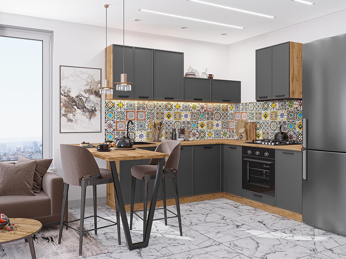 Угловая модульная кухня Фрейм-03 Stormy Silk - Дуб Вотан 2140*2200/2000*600