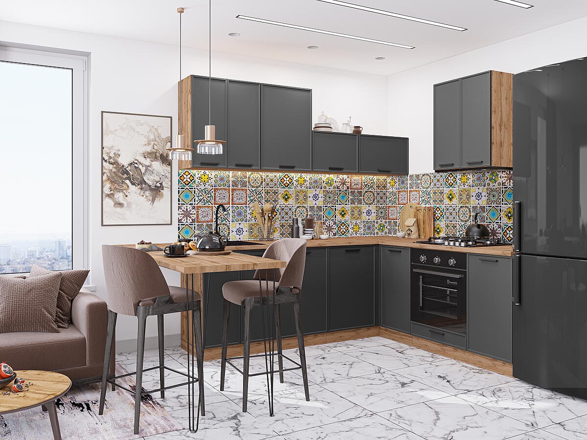 Кухня Фрейм — это сочетание маленьких незаметных деталей, которые складываются в общую композицию удобства комфорта и надежности. Выглядит такая кухня одновременно легкой и функциональной. Гладкие фасады смотрятся оригинально и стильно, а тонкая рамка по периметру разбавит — однотонность — гарнитура, выделяя центральные части шкафов, что делает его более эстетичным и привлекательным. Однотонная — поверхность — фасадов гармонично сочетается с темной фурнитурой и структурой дерева. Фасады с покрытием ПЭТ можно отнести к антивандальным — У них хорошая устойчивость к царапинам и выцветанию, за счет чего фасады сохранят свой внешний вид на протяжении многих лет.