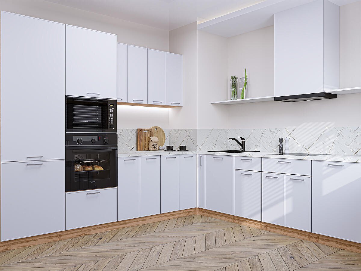 Кухня Квадро имеет безупречную архитектуру фасада и лаконичный рисунок фрезеровки. Отличное решение для интерьера в минималистичном стиле. Фасады с узкими рамочными элементами изготовлены из МАФ толщиной 19 мм. Гладкая и приятная на ощупь поверхность устойчива к повреждениям, не потускнеет со временем от воздействия ультрафиолета. При касании на поверхности не остаются загрязнения и отпечатки пальцев.