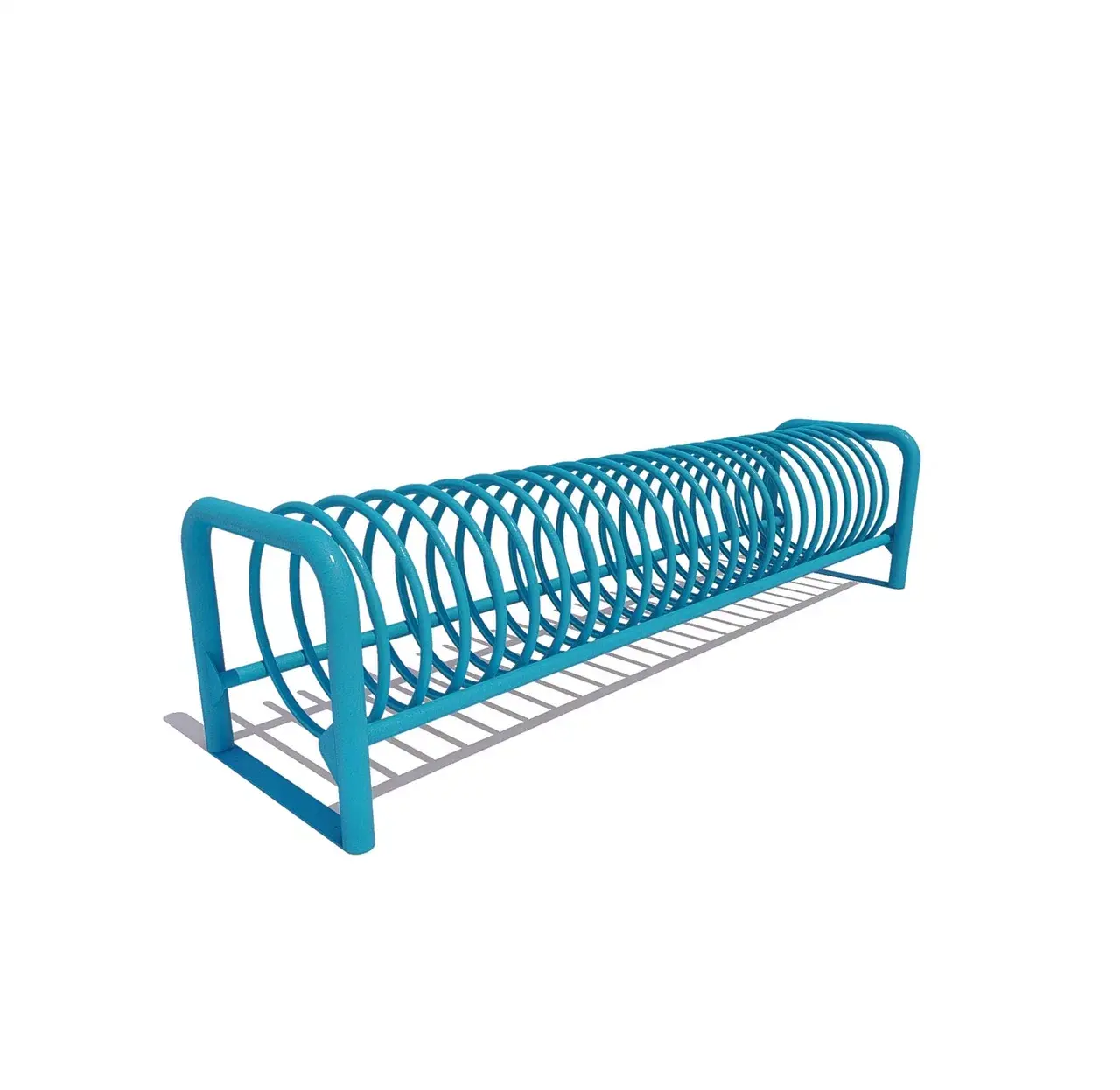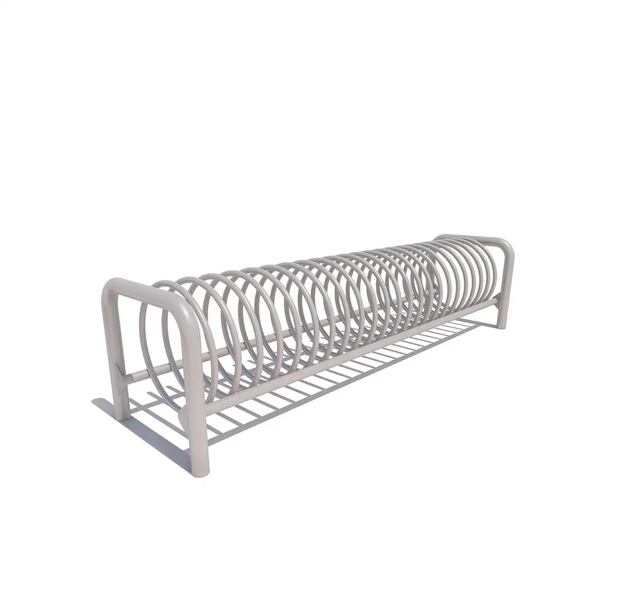 Велопарковка изготовлена из стали, имеет стандартную конструкцию с ячейками и рассчитана на большое количество велосипедов. Каркасная часть выполнена из профильной трубы увеличенного диаметра, в качестве перегородок секций использованы трубы меньшего размера. Боковые основания имеют вид прямоугольников, сплошные стенки отсутствуют, и громоздкий объект не выглядит массивным. В зависимости от пожеланий заказчика можно купить велопарковку в разных оттенках. Для окрашивания используется специальная краска – яркий оттенок не выцветает и редко требует обновления. Невысокий объект занимает мало места, функционален и выполнен в духе минимализма.