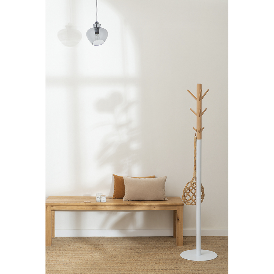 Вешалка напольная Espen великолепно дополнит прихожую с современным или эклектичным дизайном. Лаконичные формы, отсутствие лишних деталей и нейтральное цветовое решение позволяют вписать модель в интерьер с любым оформлением. Конструкция имеет прочное железное основание с износостойким порошковым покрытием. Верхняя часть изготовлена из натурального дерева. Такое сочетание материалов обеспечивает изделию практичность и долгий срок службы. Каждый крючок выдерживает нагрузку до 5 кг, а вешалка в целом – не более 20 кг.Материалы: железо с порошковым покрытием, дерево. Высота: 174 см. Цвет: белый/натуральное дерево.