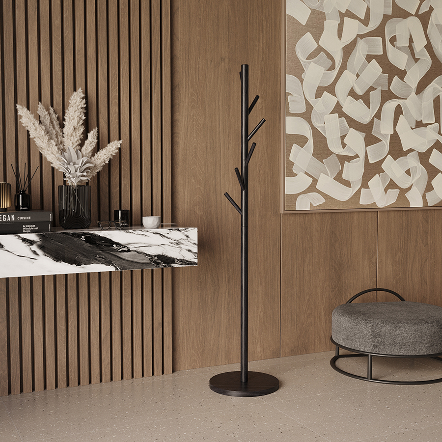 Вешалка для одежды и аксессуаров Forsty изготовлена из натуральной древесины бука, что обеспечивает ей презентабельный вид и хорошие эксплуатационные характеристики. Отсылка к эко-стилю позволяет вписать модель в различные интерьерные решения, привнести в оформление комнаты ощущение единения с природой. Благодаря компактности эта напольная конструкция идеально подходит для прихожих с небольшой площадью. Каждый крючок выдерживает нагрузку до 5 кг, а вешалка в целом – не более 20 кг.Материалы: древесина бука. Высота: 173 см. Цвет: черный.