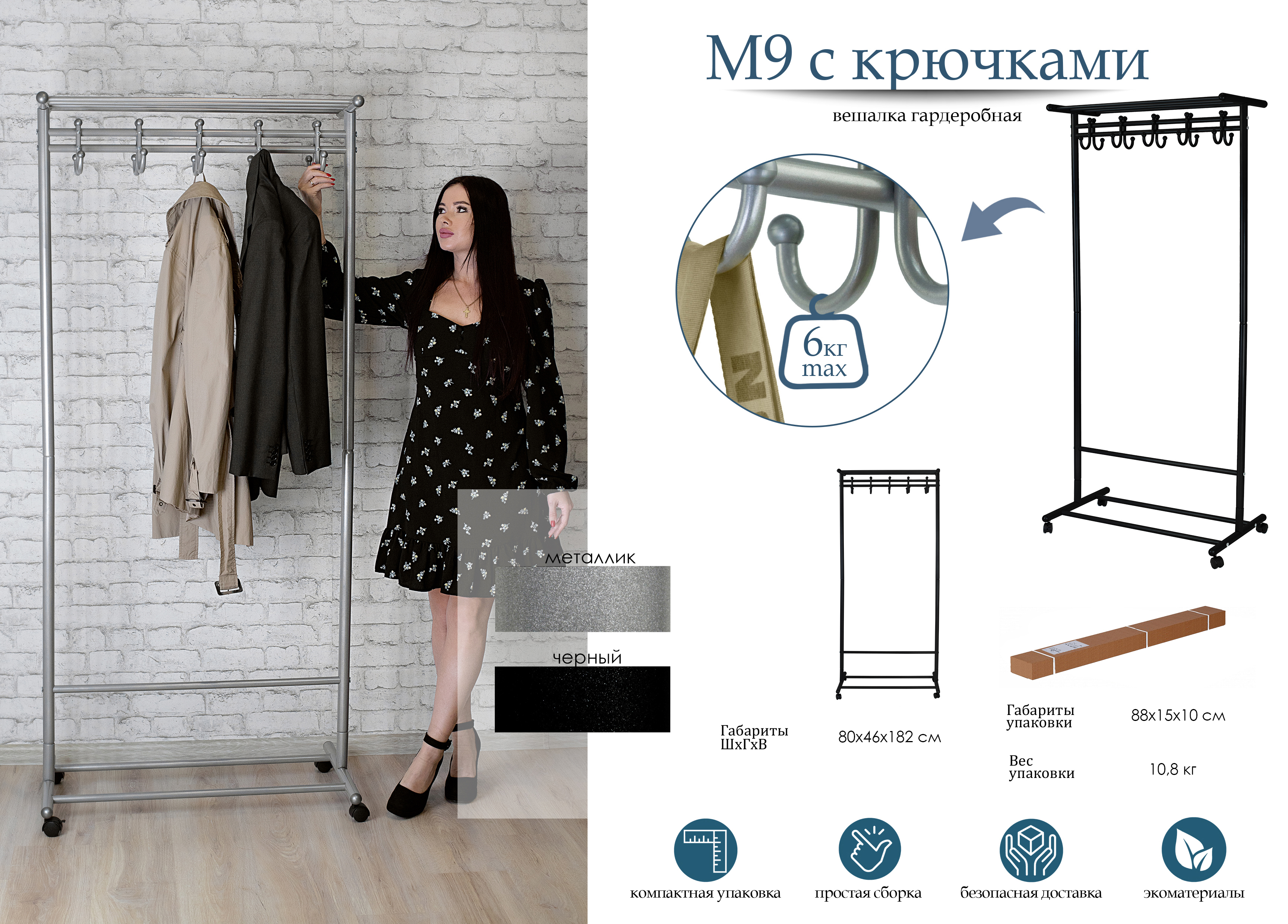 Напольная вешалка М 9 прекрасно подойдет для организации пространства в доме или квартире. Металлические трубки и крючки изделия выполнены из прочных материалов, диаметром 30 и 12 мм, что обеспечивает надёжность. Полимерное покрытие всех деталей защищает модель от возможных повреждений. Высота вешалки 175см, а ширина 80см. Благодаря наличию колёсиков Вы сможете с легкостью перемещать изделие, а два универсальных варианта расцветки помогут гардеробной вешалке вписаться в любой интерьер. Материалы: труба д. 30 мм, крючки- труба д. 12 мм, полимерное покрытие Упаковка: 88х15х10 см., 1 место Вес: 10,8 кг Цвет: металлик, черныйХарактеристики
