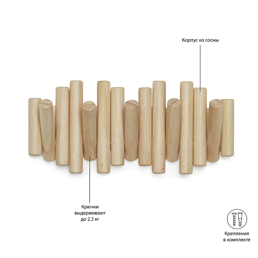 Настенная вешалка Picket превращает функциональность в искусство и идеально подходит для всех, кто ценит красоту в каждой детали. Такой аксессуар не только поможет сделать пространство более организованным, но и станет его стильным акцентом. Вешалка состоит из сосновых колышков разных размеров и оснащена пятью откидными крючками, каждый из которых выдерживать вес до 2,3 кг. Если крючки не используются, их можно легко убрать, превратив функциональный элемент в арт-объект. В комплект входит необходимый крепеж для быстрой и простой установки.Используйте вешалку Picket от Umbra в прихожей для пальто и сумок, в спальне для аксессуаров или в гостиной для декоративных элементов – она прекрасно смотрится в любом интерьере.