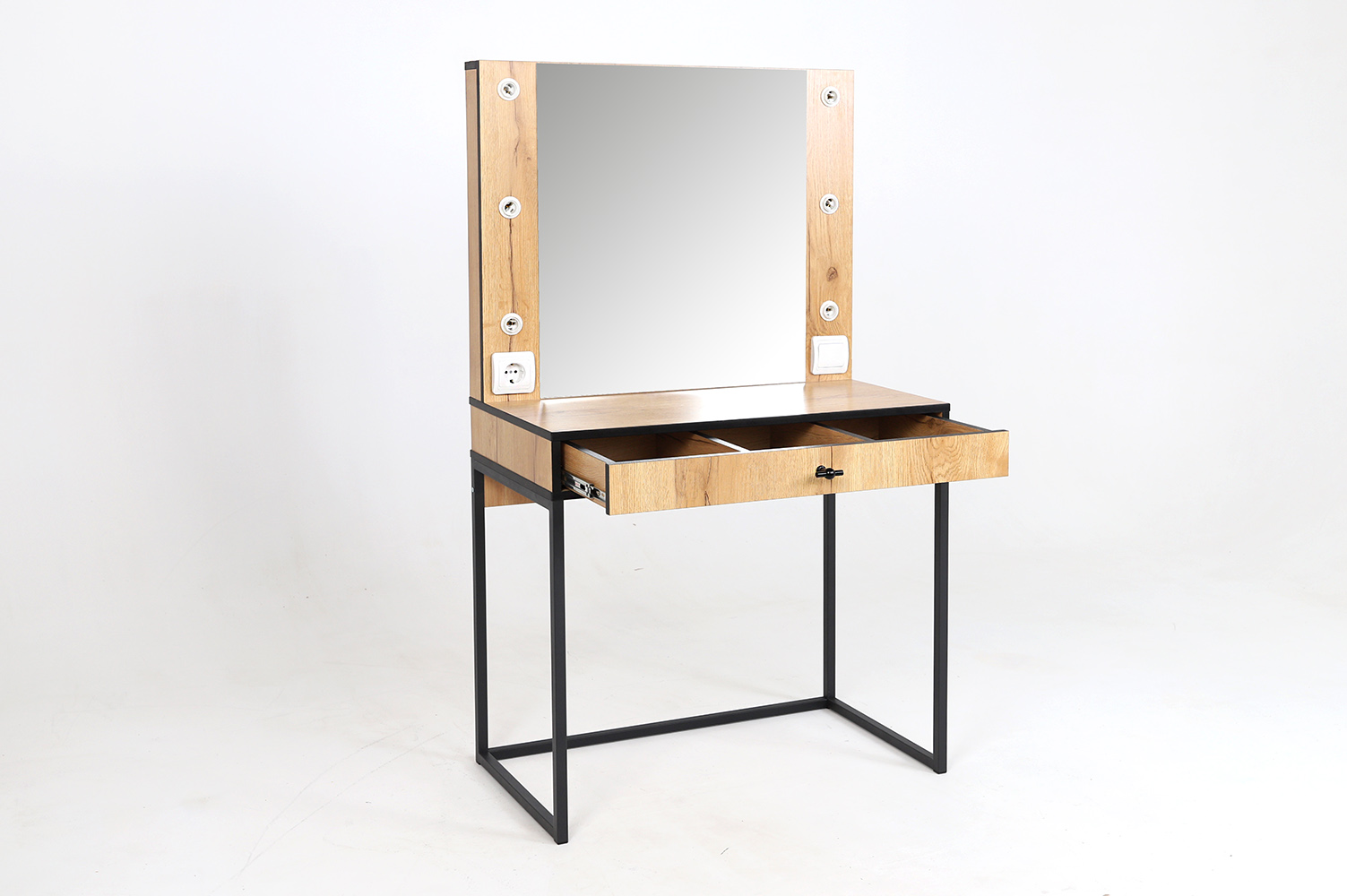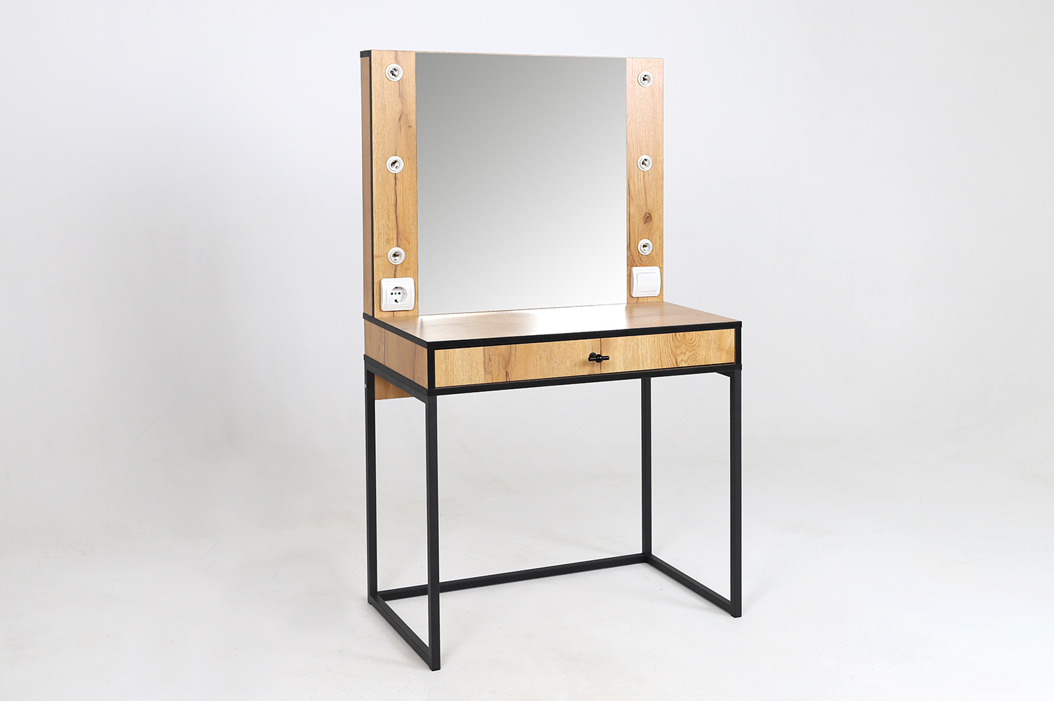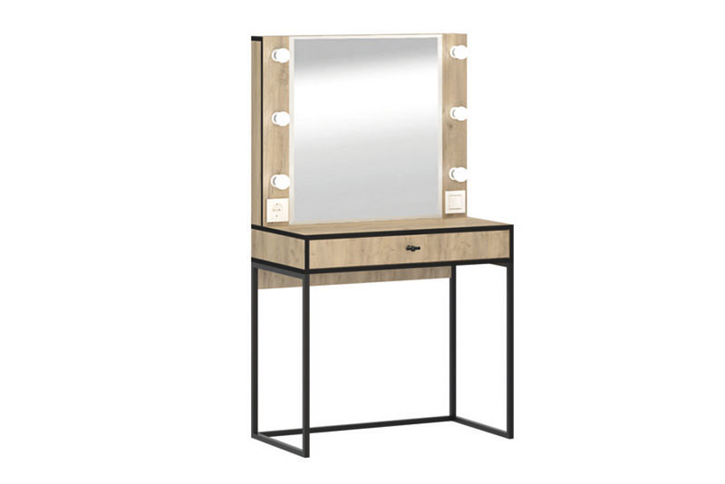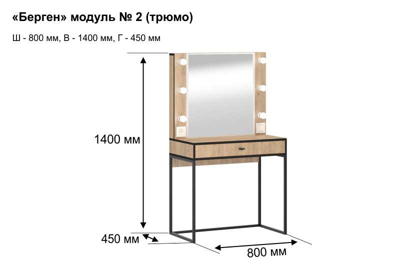 Трюмо из серии “Берген” имеет опоры из металлической профильной трубы, вместительный ящик с тремя отсеками для мелочей и большое зеркало с фацетом, в которое смотреться одно удовольствие!Характеристики