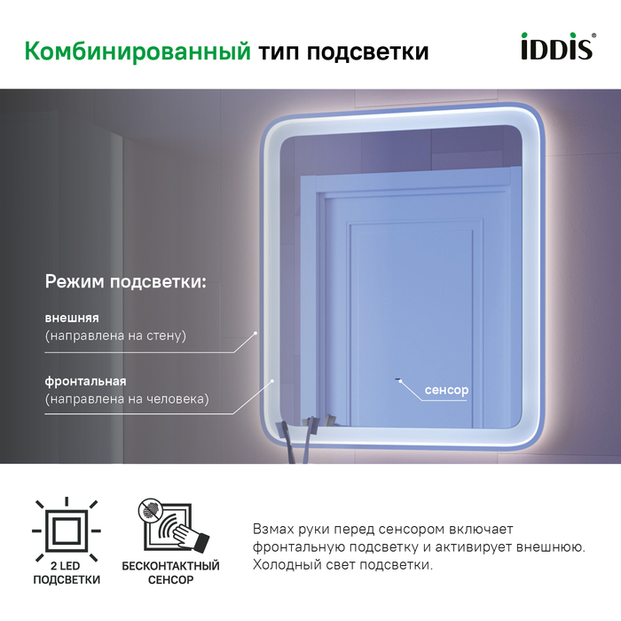Бесконтактный сенсор, диммер, две подсветки: фронтальная и на стену