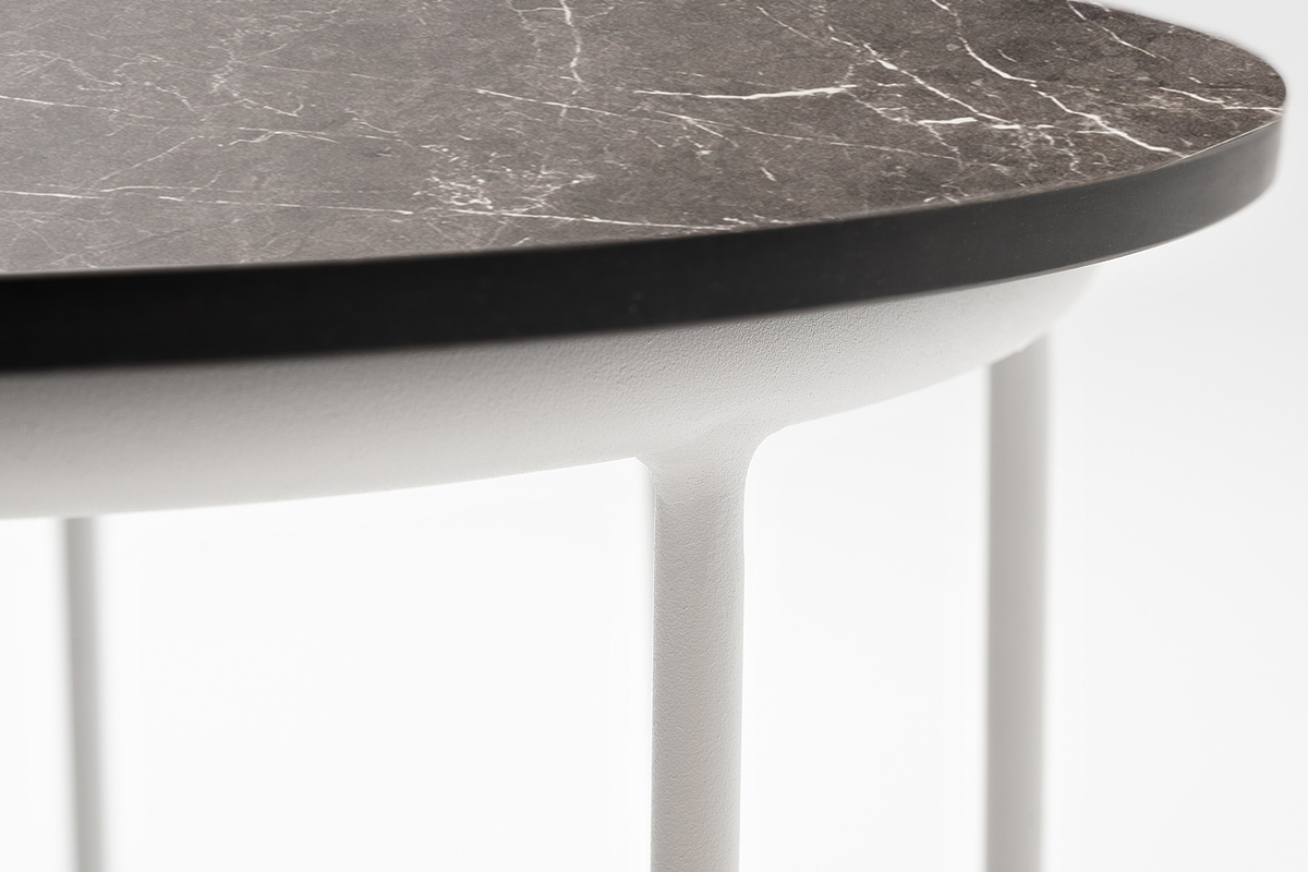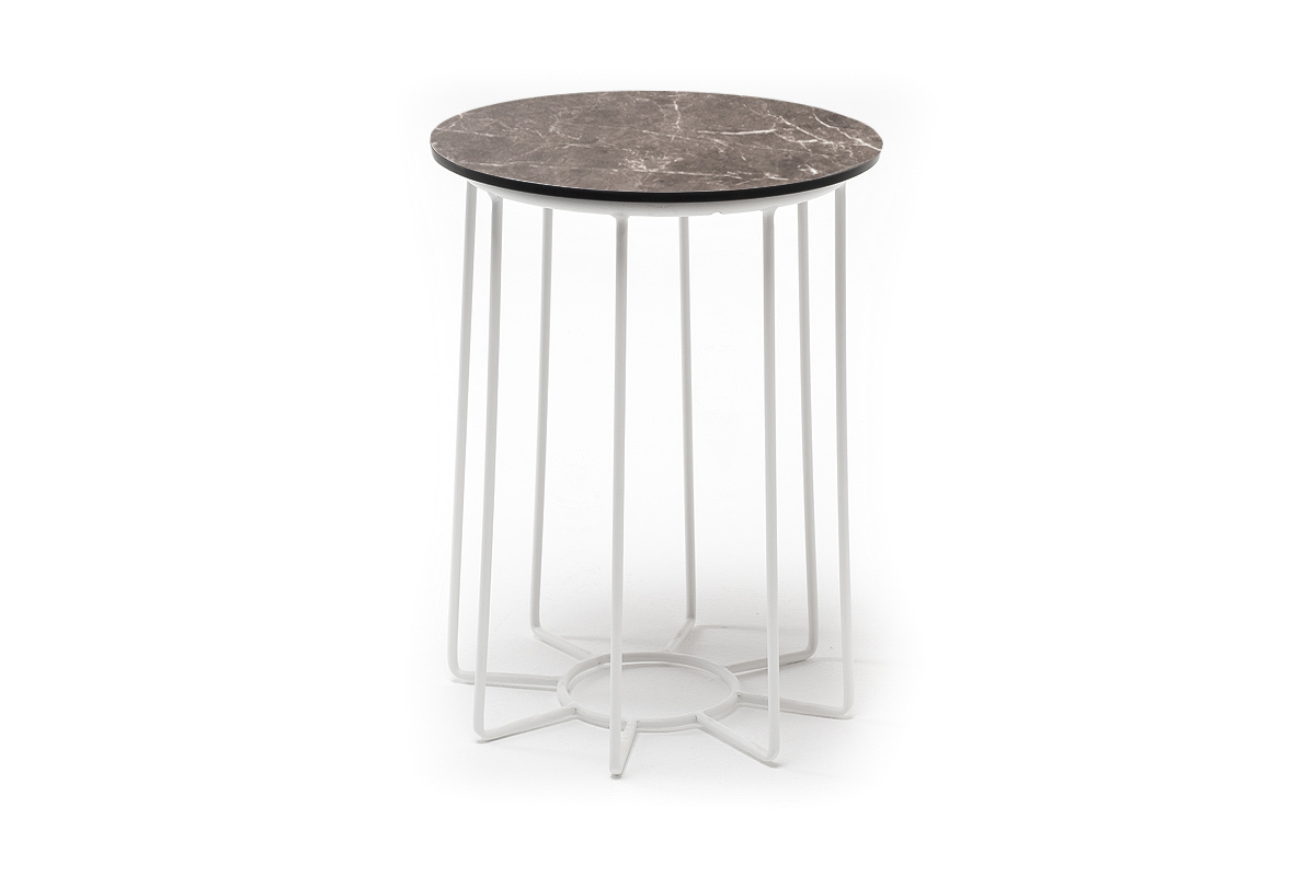 "Эквадор" журнальный стол из HPL круглый Ø40 H55, каркас из алюминия белый муар, цвет столешницы "серый мрамор" | |