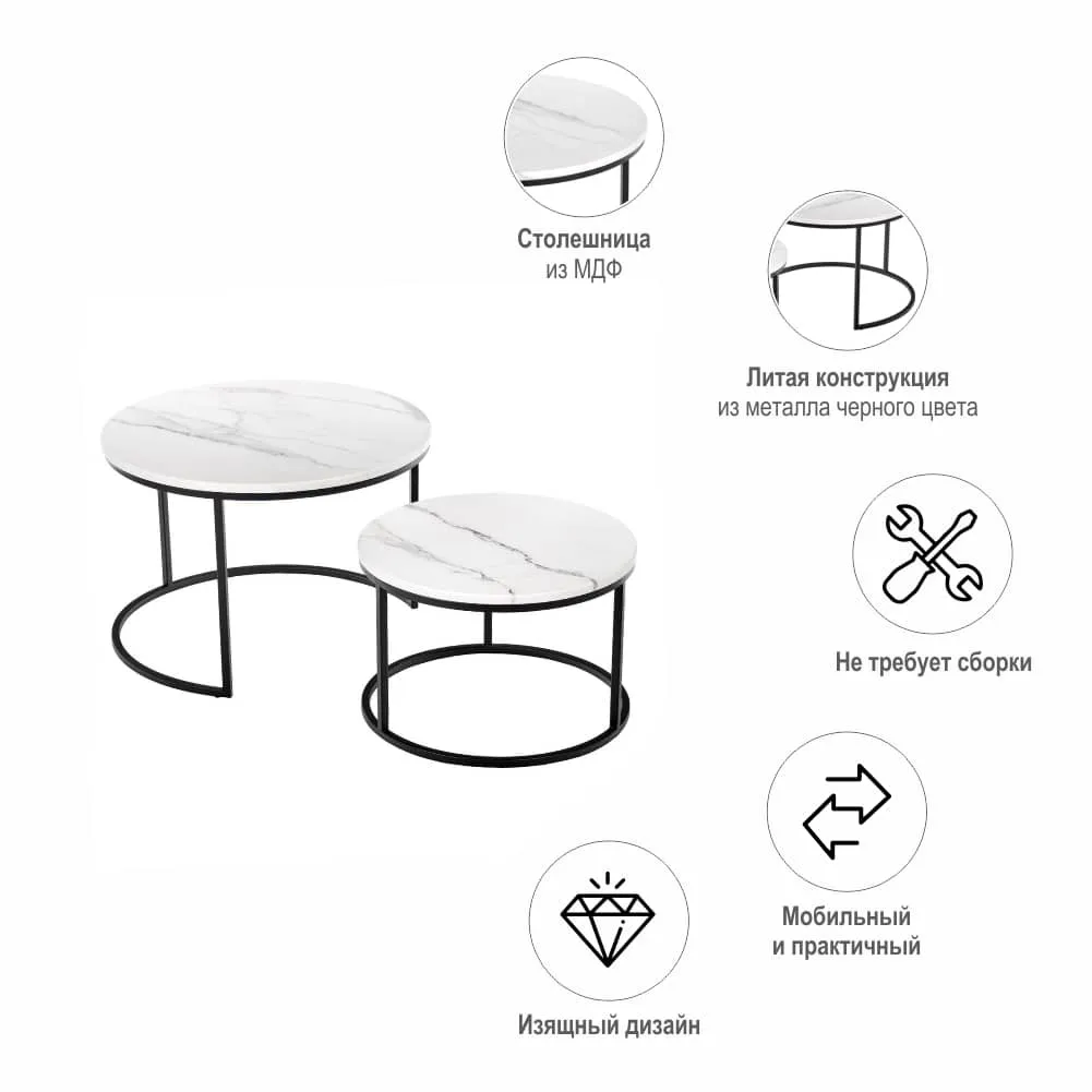 Материал: МДФ 16 мм. в пленке ПВХ белый мрамор, ножки из металла черного цвета (порошковое покрытие). Размер большого столика: диам.60х42см Размер маленького столика: диам.47,5х32см Вес: 10 кг. Поставляется в собранном виде.Характеристики