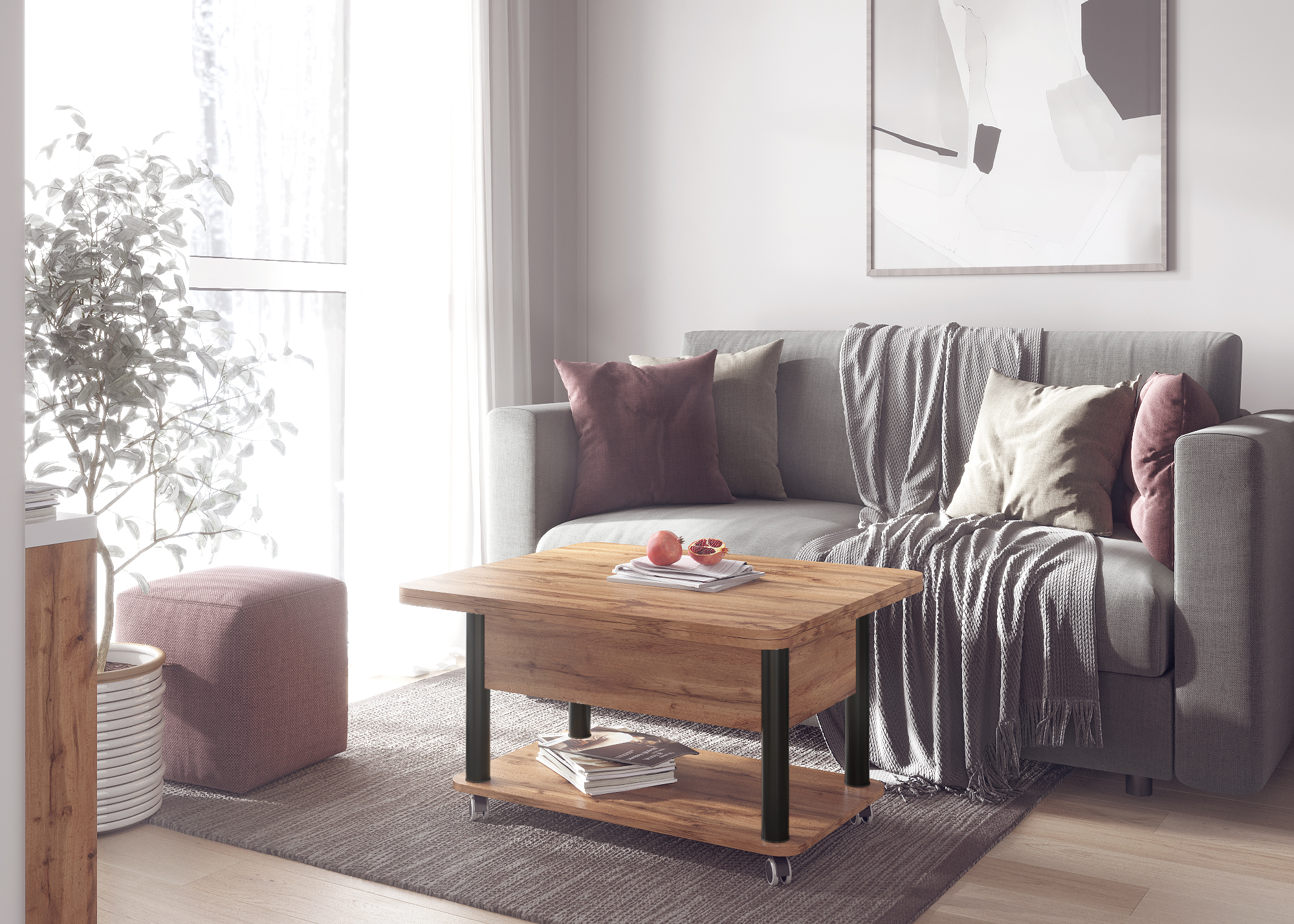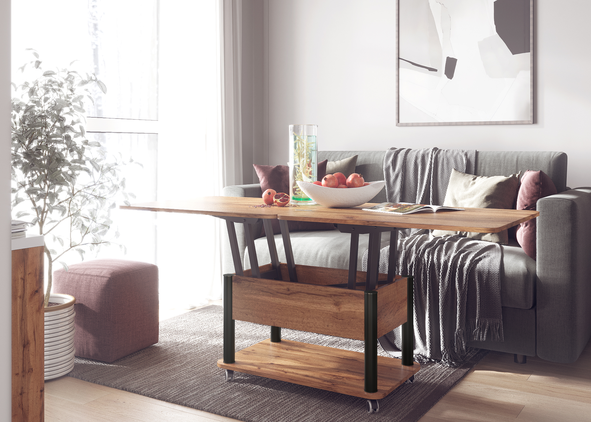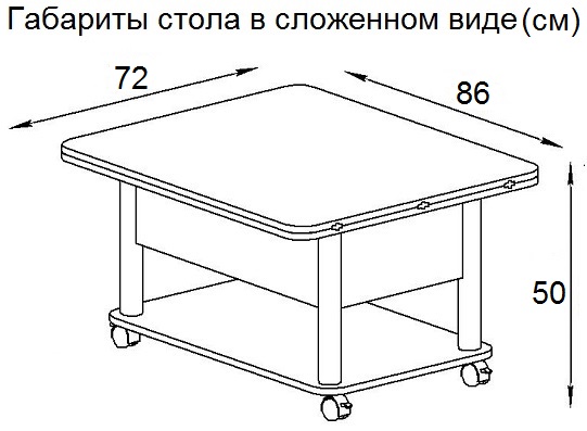 Функциональный журнальный стол легко превращается в полноценный обеденный стол на 6-8 человек. Стол Дебют характеризует усиленная конструкция механизма трансформации и одновременно плавное и легкое раскладывание. Эргономичность за счет оптимальной высоты, размеров, а также зауженное основание обеспечивает максимальное удобство и комфорт. Углы столешницы скруглены, что обеспечивает дополнительную безопасность. Габаритные размеры стола (см): в сложенном виде: Длина: 86 Ширина: 72 Высота: 48,8 В разложенном виде: Длина: 172 Ширина: 72 Высота: 73,3 Материалы: ЛДСП / МеталлХарактеристики