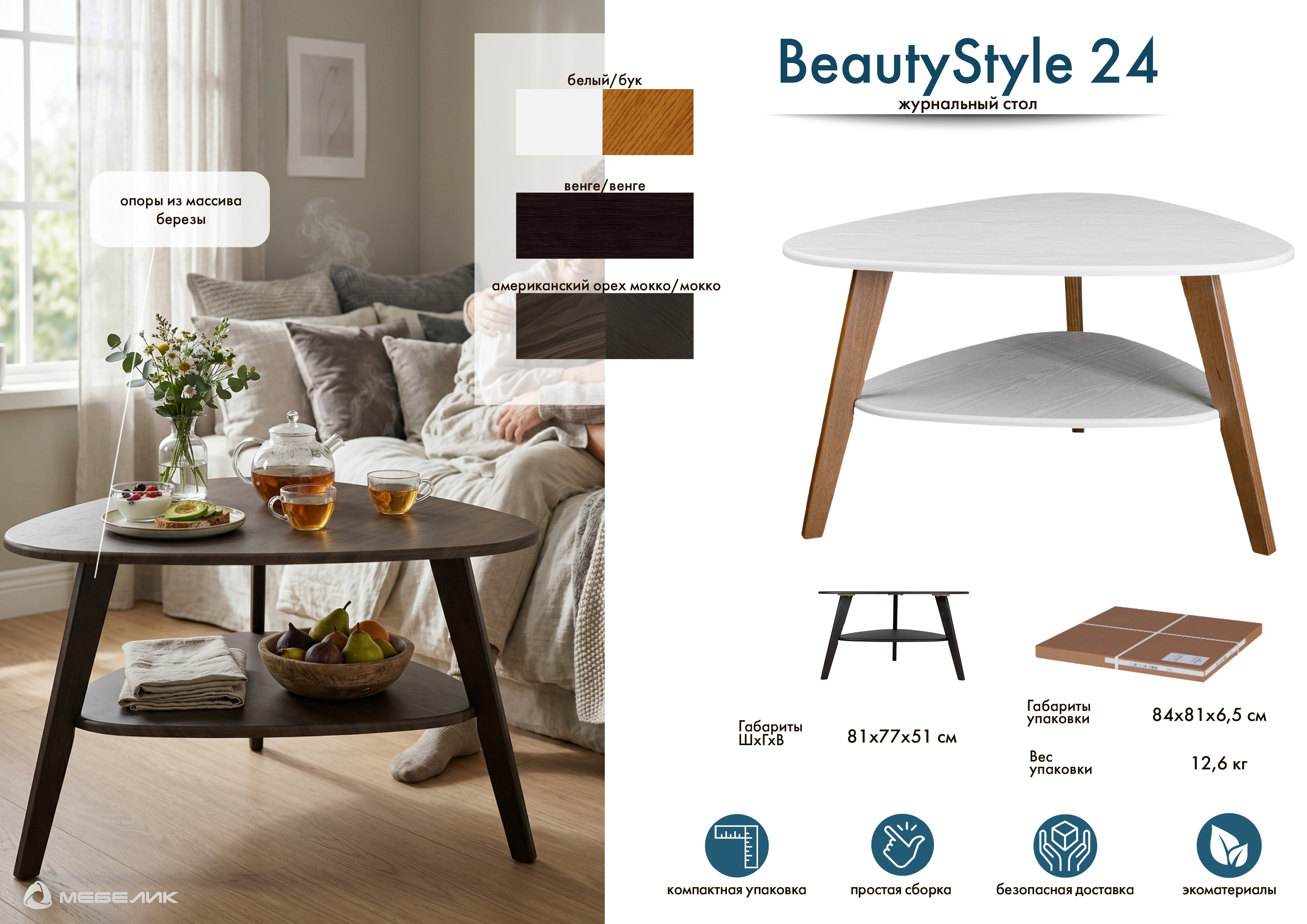 Журнальный стол BeautyStyle 24 будет идеальным дополнением для Вашего дома или квартиры. Форма мягкого треугольника и экологичные материалы придают ему элегантный вид, который легко впишется в любой интерьер. Опоры из шпона березы и столешница выполнена из МДФ, обеспечивая прочность конструкции и долгий срок службы. Влагостойкое покрытие защитит стол от повреждений и сохранит первозданный вид на протяжении многих лет. Материалы: МДФ+плёнка, шпон березы Упаковка: 84*81*6,5 см , 1 место Вес: 12,6 кг Цвет: белый/бук, венге/венгеХарактеристики