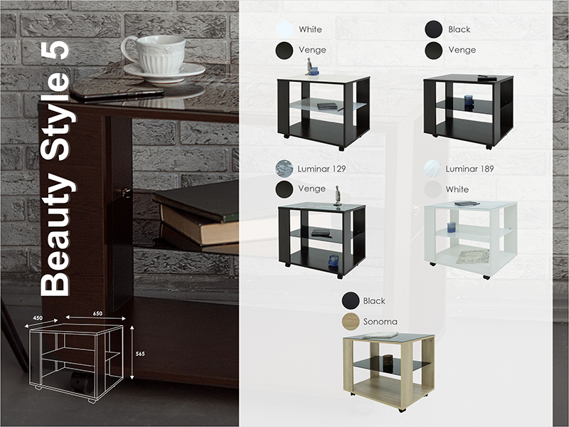 Журнальный стол Beauty Style 5 – более крупный вариант модели Beauty Style 6, который заслуженно является лидером продаж среди столов этой серии. Если вы не слишком стеснены в площади, то лишние 20см точно не будут лишними. Большая поверхность стола и две очень вместительные полки позволят вам использовать этот стол не просто как место для хранения любимых журналов или книг, но и как сервировочный столик и даже как рабочий. Конечно, перевозить на этом столе предметы сервировки не нужно, но поставить коктейли и блюдо с канапе, или просто разместить на нем все, что необходимо для легкого завтрака – легко. Вы можете расположить на нем любимый ноутбук, и вам еще хватит места для чашечки кофе. Столик легко перемещать по комнате, благодаря колесикам, два из которых со стопором, что делает стол более устойчивым. Вы можете подобрать столик понравившегося вам цвета из множества сочетаний, которые есть в нашем ассортименте. Стол Beauty Style 5 – выбор рационального прагматичного человека, ценящего удобство и практичность. ___ Журнальный столик с деревянной столешницей - не только украшение интерьера, но и весьма полезная в повседневной жизни вещь. Имея в своей обстановке журнальный столик, вы сможете хранить на нем тысячу ненужных вещей, сможете его быстро сервировать для нежданных гостей, редко, но сможете использовать его как стол письменный, кухонный, сервировочный, кофейный, или как туалетный столик. Стол журнальный - универсальная вещь. При выборе обратите внимание не только на габаритные размеры, но особенно на высоту. Если он будет стоять около дивана, то это особенно важно. Некрасиво, когда поверхность журнального стола выше сиденья, но и слишком низкие журнальные столики не всегда удобны - придется нагибаться. Сделайте свой выбор, а мы позаботимся о том, чтобы покупка стала для вас приятной. РАЗМЕР: 65х45,h56,5см Материалы: ЛДСП, столешница с приклеенным стеклом, полка - цветное стекло, колесные опоры Упаковка: 73х48х7 см, 1 место Вес: 20,8 кг Цвет: белый/Luminar 189Характеристики