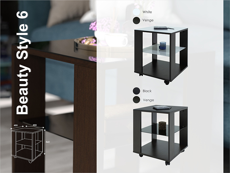 Журнальный стол Beauty Style 6 - уже долгое время заслуженно является лидером продаж среди столиков этой серии. В нем привлекают и его небольшие размеры – всего 45*45см, и, при этом, целых три поверхности, на которых можно разместить большое количество мелочей, и наличие колесиков, при этом два из них со стопором, которые позволяют легко перемещать этот столик с одного места на другое, а колеса на которых стопор, делают его более устойчивым и большое количество оттенков оформления как столешницы, так и каркаса. Этот столик универсальный и экономичный. Это верный выбор рационального человека, учитывающего и функциональное наполнение и соотношение цена – качество. Поверхность стола может быть как со стеклом, так и без с текла в зависимости от модификации. Со стеклом – легче ухаживать, без стекла – экономичнее. Если вы подбираете практичный небольшой журнальный столик, то эта модель – отличный выбор.___ Журнальный столик с деревянной столешницей - не только украшение интерьера, но и весьма полезная в повседневной жизни вещь. Имея в своей обстановке журнальный столик, вы сможете хранить на нем тысячу ненужных вещей, сможете его быстро сервировать для нежданных гостей, редко, но сможете использовать его как стол письменный, кухонный, сервировочный, кофейный, или как туалетный столик. Стол журнальный - универсальная вещь. При выборе обратите внимание не только на габаритные размеры, но особенно на высоту. Если он будет стоять около дивана, то это особенно важно. Некрасиво, когда поверхность журнального стола выше сиденья, но и слишком низкие журнальные столики не всегда удобны - придется нагибаться. Сделайте свой выбор, а мы позаботимся о том, чтобы покупка стала для вас приятной. Материалы: ЛДСП, столешница с приклеенным стеклом, полка - цветное стекло, колесные опоры Упаковка: 54х48х6,5 см, 1 место Вес: 18,10 кг Цвет: венге/стекло белое, венге/стекло черное, дуб крафт золотой/стекло черноеХарактеристики