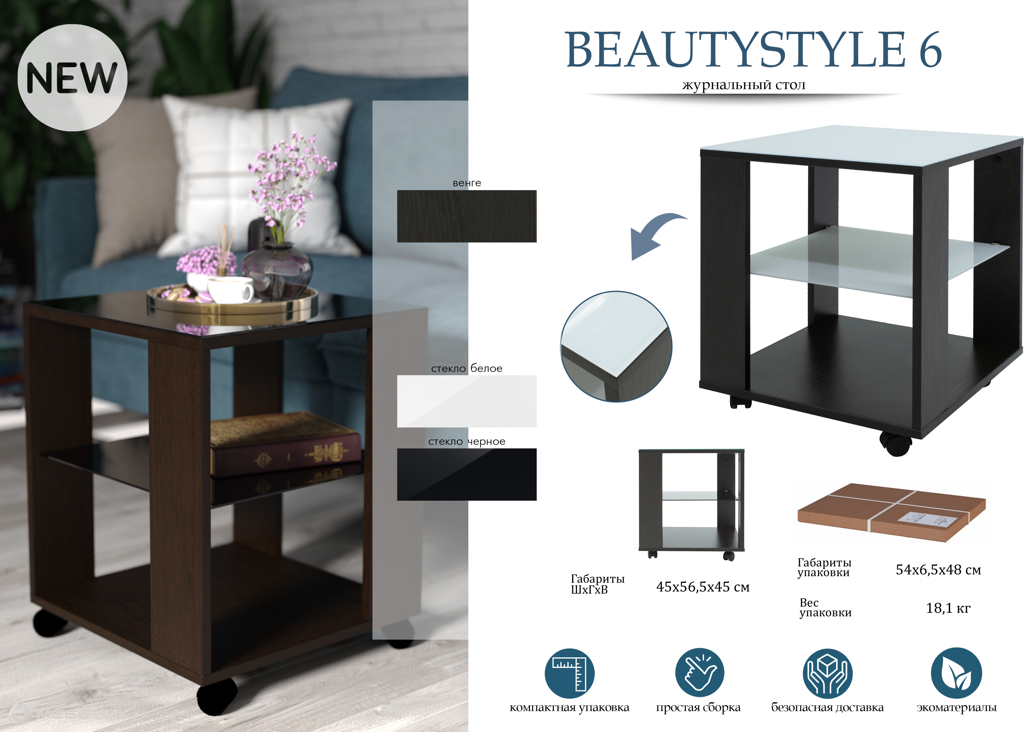 Журнальный стол Beauty Style 6 - уже долгое время заслуженно является лидером продаж среди столиков этой серии. В нем привлекают и его небольшие размеры – всего 45*45см, и, при этом, целых три поверхности, на которых можно разместить большое количество мелочей, и наличие колесиков, при этом два из них со стопором, которые позволяют легко перемещать этот столик с одного места на другое, а колеса на которых стопор, делают его более устойчивым и большое количество оттенков оформления как столешницы, так и каркаса. Этот столик универсальный и экономичный. Это верный выбор рационального человека, учитывающего и функциональное наполнение и соотношение цена – качество. Поверхность стола может быть как со стеклом, так и без с текла в зависимости от модификации. Со стеклом – легче ухаживать, без стекла – экономичнее. Если вы подбираете практичный небольшой журнальный столик, то эта модель – отличный выбор.___ Журнальный столик с деревянной столешницей - не только украшение интерьера, но и весьма полезная в повседневной жизни вещь. Имея в своей обстановке журнальный столик, вы сможете хранить на нем тысячу ненужных вещей, сможете его быстро сервировать для нежданных гостей, редко, но сможете использовать его как стол письменный, кухонный, сервировочный, кофейный, или как туалетный столик. Стол журнальный - универсальная вещь. При выборе обратите внимание не только на габаритные размеры, но особенно на высоту. Если он будет стоять около дивана, то это особенно важно. Некрасиво, когда поверхность журнального стола выше сиденья, но и слишком низкие журнальные столики не всегда удобны - придется нагибаться. Сделайте свой выбор, а мы позаботимся о том, чтобы покупка стала для вас приятной. Материалы: ЛДСП, столешница с приклеенным стеклом, полка - цветное стекло, колесные опоры Упаковка: 54х48х6,5 см, 1 место Вес: 18,10 кг Цвет: венге/стекло белое, венге/стекло черное, дуб крафт золотой/стекло черноеХарактеристики