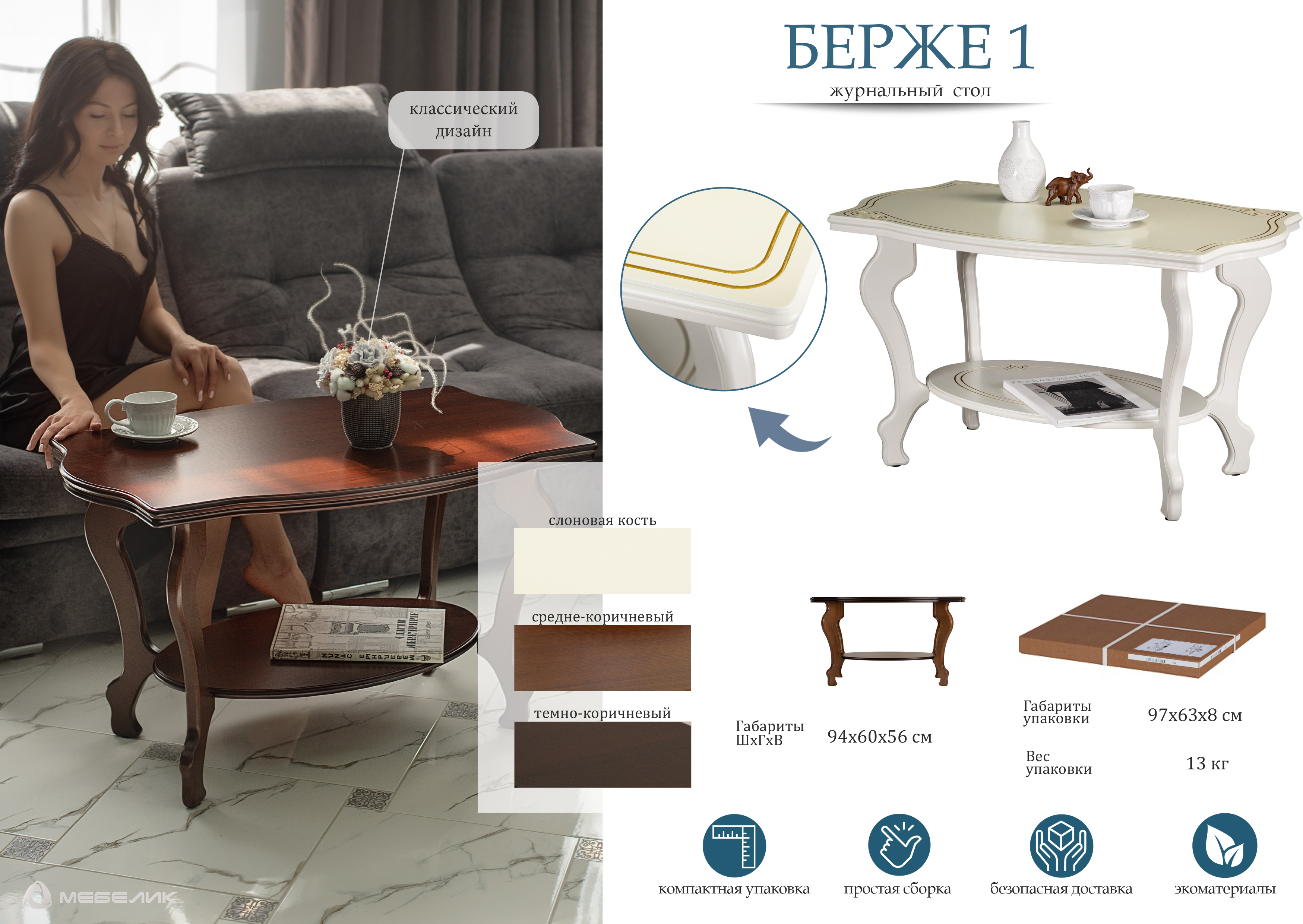 Вы можете купить Стол журнальный Мебелик Берже 1 слоновая кость оптом в нашем магазине, предложим цену с оптовой скидкой.