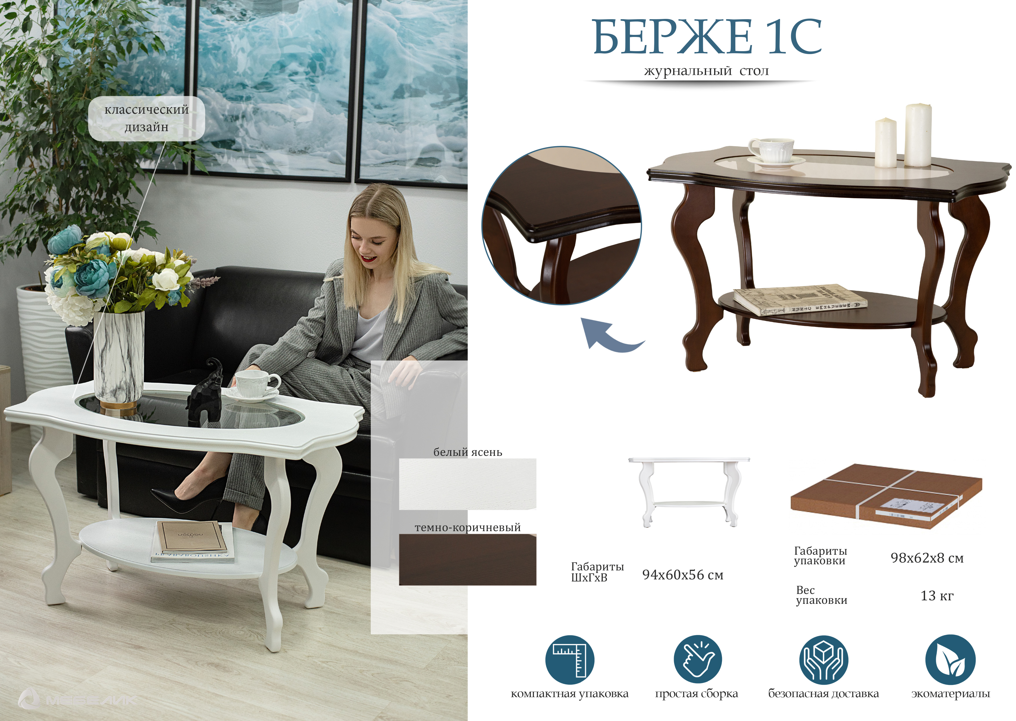 Классический столик в гостиную или спальню Форма стекла перекликается с формой полочки Удобная высота столика Окрашен в темнокоричневый цвет и покрыт надежным лаком, тонированное стекло Надежно упакован в одну коробку, легко собирается ___ Журнальный столик Берже 1 выполнен в классическом стиле. Его ножки и рельефная кромка столешницы изящно изогнуты. Модель прекрасно дополнит традиционный дизайн дома или офиса. Благодаря наличию дополнительной полочки, на поверхности стола помещается множество вещей. Функциональный предмет мебели станет не только полезным, но и стильным акцентом Вашего интерьера. Материалы: лмдф, массив, стекло, эмаль, лак Упаковка: 98х62х8 см, 1место Вес: 13 кг Цвет: темно-коричн.Характеристики