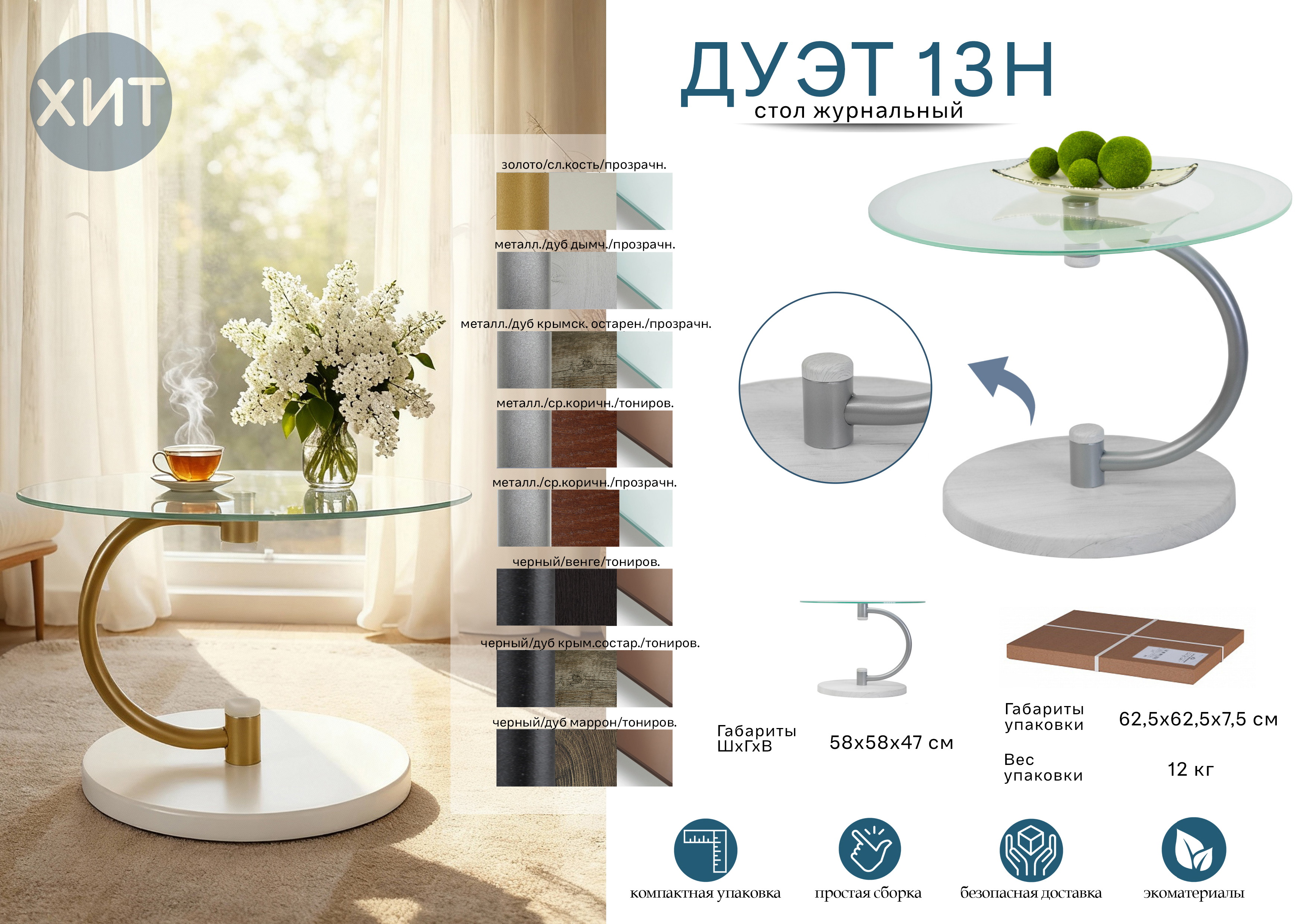 Небольшой, но массивный – вес 12кг! и устойчивый журнальный стол со стеклянной столешницей диаметром 58см, мощным основанием диаметром 42см из лмдф и опорой в виде полукруга идеально подойдет для оформления зон отдыха офисных и общественных помещений, современных частных интерьеров. Мы увеличили цветовые варианты отделки до пяти и теперь еще более просто стало подобрать подходящий вариант под ваш интерьер. Средне-коричневый, слоновая кость, дуб дымчатый, дуб крымский состаренный, дуб маррон – это варианты отделки основания и декоративных элементов, черный или металлик – варианты цвета опоры, и, кроме того, на выбор – прозрачное, либо тонированное стекло с пескоструйным рисунком в виде кольца. В комплекте фетровые подпятники – для исключения повреждения пола песком и другими абразивами. Стол компактно упакован в одну коробку, очень легко собирается, гигиеничен, прост в уходе, долго прослужит при интенсивном использовании. Стол сочетается с напольными вешалками серии «Декарт». Отличный выбор за справедливую цену.___ Журнальный столик с деревянной столешницей - не только украшение интерьера, но и весьма полезная в повседневной жизни вещь. Имея в своей обстановке журнальный столик, вы сможете хранить на нем тысячу ненужных вещей, сможете его быстро сервировать для нежданных гостей, редко, но сможете использовать его как стол письменный, кухонный, сервировочный, кофейный, или как туалетный столик. Стол журнальный - универсальная вещь. При выборе обратите внимание не только на габаритные размеры, но особенно на высоту. Если он будет стоять около дивана, то это особенно важно. Некрасиво, когда поверхность журнального стола выше сиденья, но и слишком низкие журнальные столики не всегда удобны - придется нагибаться. Сделайте свой выбор, а мы позаботимся о том, чтобы покупка стала для вас приятной. Материалы: стекло 8мм, металл, МДФ Упаковка: 62,5*62,5*7,5 см, 1 место. Вес: 12 кг Основание d 42 см Цвет: слоновая кость, средне-коричн., венге, дуб дымчатый, дуб крымский состаренный, дуб маррон.Характеристики